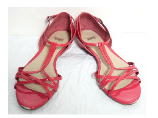 USED品正規品の CAMPER(生産国表示は見当たりません。)のピンク色系のエナメルのサンダルのサイズ37(23.5cm)の箱ナシです。