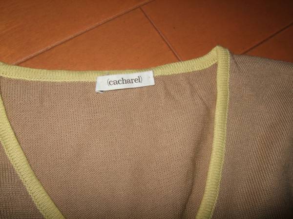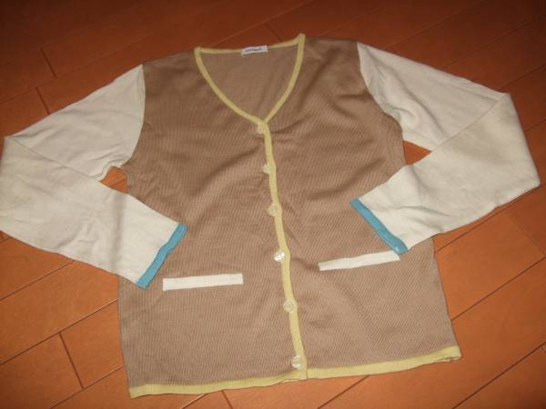 キャシャレルのカーディガン、素材はアクリル、ウール各50です。バスト約77、丈約51、肩幅約31.5です。ベージュとアイボリーを基調とした優しい上品な色合いで、着用回数も少なく、全体的にはきれいな印象でまだ長くお使いいただけます。多少のユーズド感はありますが、気持ちよくきていただけます。サイズ表示は14という数字があるのですが、マメールの扱いでもあるので、もしかしたら、ティーンズのものかもしれないのですが、普通に女性の9号くらいの方は着用いただけます。だいたいM程度かと思います。ぜひご検討ください。。