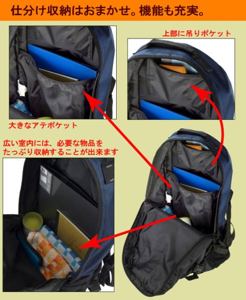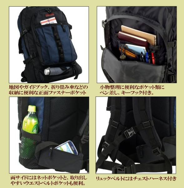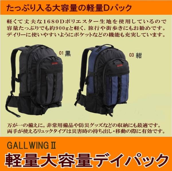 | ★ガルウィング GULLWING 頼れる大容量 大小ポケットも充実 小物が迷子にならない高機能 ご好評いただいておりました 『GULLWING 大型デイパック#42489』の後継製品。 使い勝手はそのままに、リニューアルいたしました。 アウトドアでの使用はもちろん、 デイリーにもお使いいただけます。 たっぷり入る大型のデイパックは災害時の 非常用持ち出し袋としても最適です。 【バッグインフォメーション】 ◆サイズ : 横幅37×高さ52×厚み20センチ ◆素 材 : 1680Dポリエスター/420Dポリスター ◆カラー : (01)黒、(03)紺 ◆本体正面 : ファスナーポケット、ファスナーオープンポケット(2ケ) ◆本体内部 : アテポケット、吊りファスナーポケット ◆本体側面 : ネットポケット(左右各1ケ) ◆オープンポケット内部 : アテポケット(大・小)、ファスナーポケット、 ペン差し、キーホルダー ◆その他仕様 : ファスナーポケット付きウエストベルト、 チェストハーネス付き ◆重量・容量 : 約900g、約34L ◆生産国 : 中国(企画:日本) ※ 予告なく仕様変更する事がありますのでご了承下さい。 使用上のご注意 ■この製品は一般的なレジャー用として 開発された商品です。 そのため書籍などの重量物を過度に収納されますと 破損の原因となりますのでおやめください。 ■直射日光や過度に高温になる場所に長時間放置されますと 退色や変形の原因になりますのでお避け下さい。 ■本品の洗濯、アイロンの使用はご遠慮ください。 ■火のそばに近づけないでください。 ■摩擦などで色落ちする場合があります ■リュックベルトは片掛けでご使用されますと 破損の原因となりますのでおやめください。 この商品を購入された方のコメント ・家族が3年程使用したデイパックがこわれてしまって、同じ物を探していました。いろいろポケットがついていて使いやすいそうです。近所の店ではほとんど見かけません。 ・大容量かつ軽量、そしてたくさんの便利な小分けポケット。これだけ容量があるリュックはなかなかお店では売っていません。荷物の多い毎日の通勤に大変重宝しています。 | |