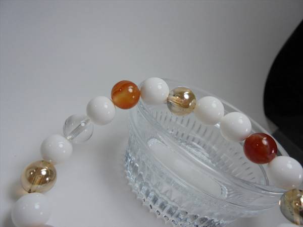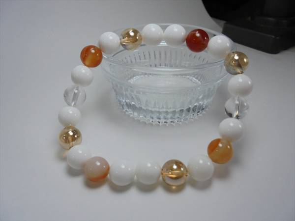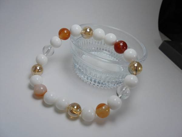 ご覧いただき誠にありがとうございます。 あなたの、心に届きます様に・・・ ホワイトオニキス: 「オニキス」と呼ばれる石のうち、白いものをさします。 「白」は純粋無垢、汚れを寄せ付けない象徴であり、また「希望の光」の意味合いも持ちます。 優れた浄化力と優しげな風合いを合わせ持ち、 心身のリーディングストーンとして無理のない癒しを導くとされます。 疲れがたまった時、心機一転したい時、小さな幸せで満たされたい時などのお守りにどうぞ。 サードニクス: オレンジレッドが印象的なサードオニキスは、「愛情」のパワーストーン。暖かな色そのままに、暖かな家族を築くとされます。 そして、家族を築くいしずえとなる夫婦となるべく、まだ見ぬ二人を導くキューピッド役を果たすとも言われます。 美しい縞目は、人生に波あれどそれこそが生の彩りである証です。 夫、妻、家族への変わらぬ愛、恋愛成就、人間的魅力アップなどのお守りにどうぞ。 水晶: 万能のパワーストーンとしてお馴染みです。邪気祓い、場の浄化の他、あらゆる開運のサポートとして力を発揮するとされます。 古くは氷の化石と思われ、水のような透明感で悪い気をそそぎ流してしまうと信じられてきました。潜在能力の発掘にも役立つと言われます。 場や気の浄化、各種開運、精神統一、願掛けなどのお守りにどうぞ。 複数落札頂くと、送料お引きします。 2000円以上の商品(ブレスレット)は、ギフトボックス(紙箱)無料で付きます。 ギフトボックス(紙箱)は、100円です(ギフト用の包装は行ってません) 「商品詳細」天然石: ホワイトオニキス 約8mm 12石 サードニクス 約8mm 4石 ゴールデンオーロラ水晶 約8mm 4石 水晶5A 約8mm 2石 サイズ:約18cm 内径:約15.5m 伸縮性の有るポリウレタンゴム又は、シリコンゴムで製作されています。 この商品には、ベロアの袋が付いています。 石の大きさやガラは、一個一個違いますので、ご了承ください。 必要以上に引張ったり、落としたり等、壊れたり、割れたりする事もございます。 天然石は特有の不純物、内包物、色むら、天然キズ、ひび等が有る場合が御座います。 撮影の際、ライトあてる為、通常よりも発色が明るく見えたり、モニターや見る場所のライトの色、明るさ等で見え方が若干異なる場合、変わります。 *サイズとサイズのお直しについて* 平置きして、直線にした時のサイズで、内径は小さくなるので、ご注意ください。 サイズのお直しのご希望の際は入金前に、ご連絡をお願いします。 小さくする時と、大きくするのは、1cmまでは無料で行います。 発送、到着後のサイズのお直しは、有料になります。 オリジナルや複数個ご希望の方は、ご連絡下さい。 発送方法 お得な(送料、箱付き)情報は、自己紹介をお読み下さい。 *** 通常は発送方法は、クリックポストでの発送になります *** ・クリックポスト-日本郵政 厚さ3cmまで、180円 ※配達状況が確認出来る発送方法に限ります。 アクセサリー等は、複数落札で送料お引きします(配送手段は基本的に選べません) 2個で、140円、3個以上(1000円以上)5個まで80円 6個以上は、送料無料です。 ただし、商品ページに、配送方法が明記して有る時は、高い物の料金に成ります。 ** クリックポストのご利用の際の注意 ** 配送中の、トラブル、潰れ、破損等、到着にかかる時間等は、一切責任は持つ事ません、ご理解の上ご利用ください。 201610301345 | |||