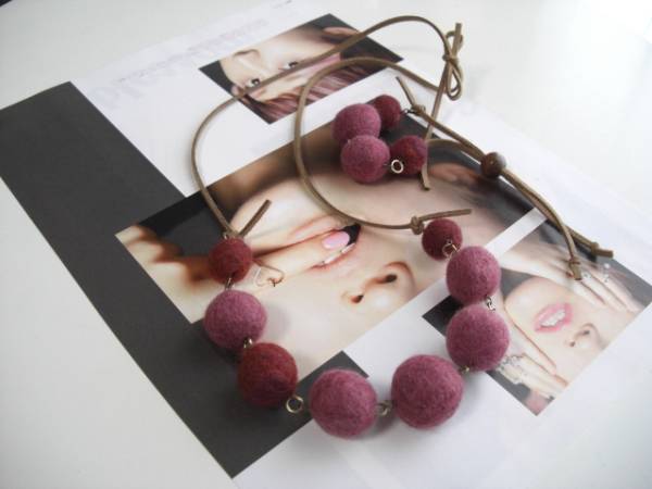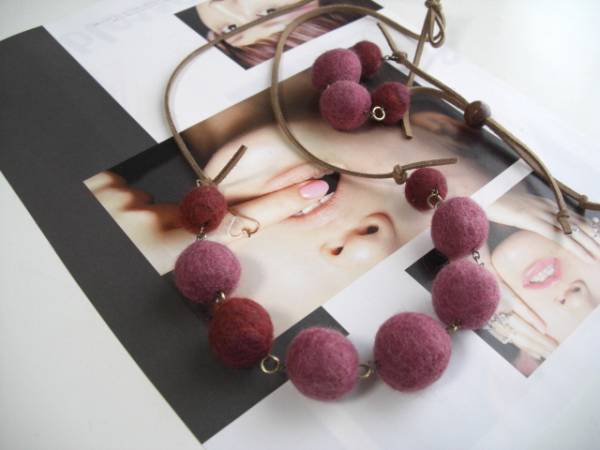 自由と遊びのパターン・・シリーズです♪軽やかに楽しんで・・ふんわりやさしいフェルト玉のネックレスとブレスレットの2点セットです♪15ミリから20ミリ位までのボルドー系の色を集めて可愛い表情です♪ダークベージュのスェード紐を合わせて甘すぎない大人のロマンチックしています♪ネックレスの長さは全長90センチ位です♪短く結んでチョーカー風にされても素敵です♪ブレスレットの長さは全長28センチ位で調節自由です♪お色違いのセットも出品しています♪ハンドメイドをご理解いただいてノークレーム・ノーリターンでお願いします♪ |
