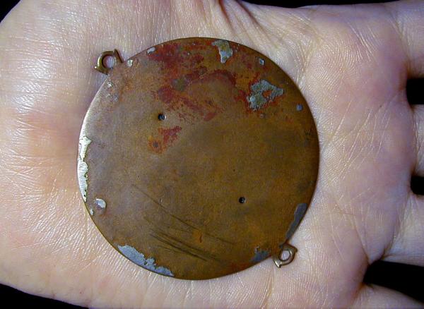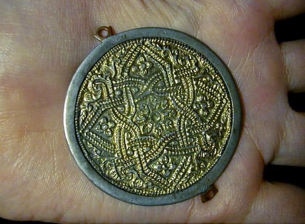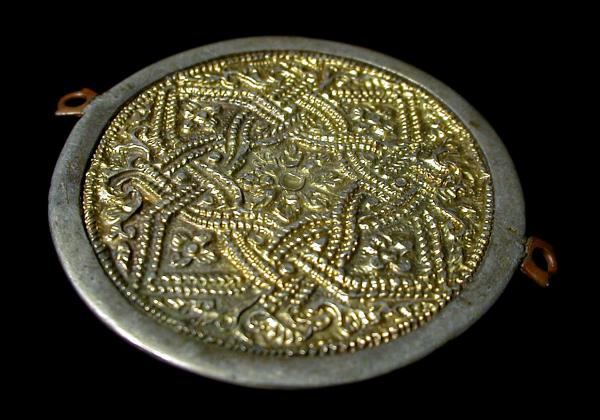 これは、銀の含有量がおよそ80%、残りは銅を混ぜてあるそうです。サイズは直径が約4.8cm、重さはおよそ14グラム。左右の穴に紐を通し、腰にくくりつけて使用しました。インドネシアのアンティーク市場では、欧米人コレクターを中心に、このトゥアリと呼ばれたかつての“異文化”をペンダントヘッドとして再利用する目的で人気があるとのことです。