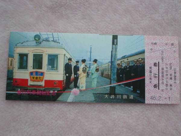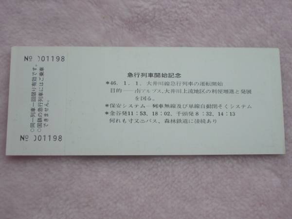 | 昭和46年 大井川鉄道 千頭駅発行 急行列車開始記念 急行券 未使用品で光沢もあり綺麗ですが46.2.1のスタンプ印あります。 サイズ約 6.5×16cm 定型110円で発送可能 ノークレーム ノーリターンでお願いします。 ノークレームノーりたん^ |