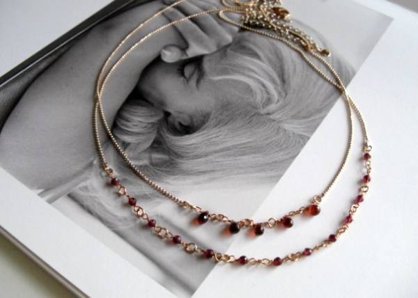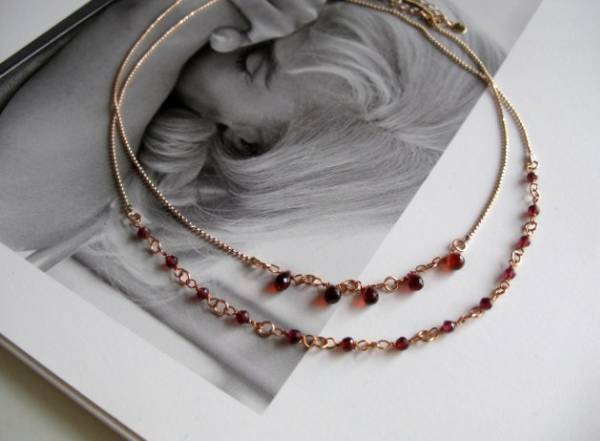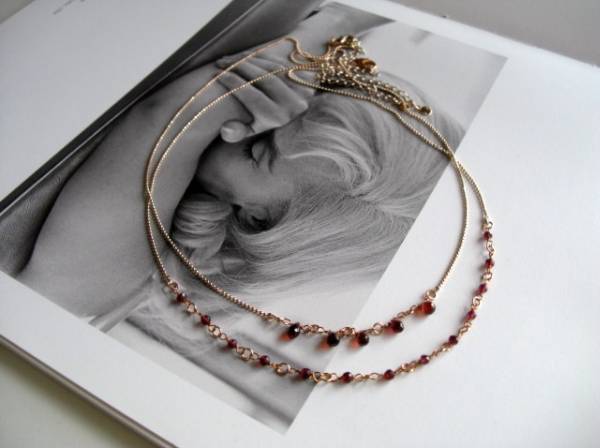 小粋にセレクト・・シリーズです♪モンローに憧れて・・深い赤のガーネットのネックレス2本セットです♪宝石質のドロップカットやラウンドカットのガーネットにピンクゴールドのボールチェーンを合わせてひっそり華やかな表情です♪6×4ミリ位のドロップカットのガーネットはランダムに繋いで可憐です♪長さは60センチ+アジャスター12センチで最長72センチ位です♪♪3ミリ位のラウンドカットのガーネットは秘めた赤が印象的です♪長さは55センチ+アジャスター10センチで最長65センチ位です♪それぞれ単品やブレスレットやピアスも出品しています♪♪シンプルで飽きのこないいつまでも着けられるデザインを考えて作りました!ハンドメイドをご理解頂いてノークレーム、ノーリターンでお願いします