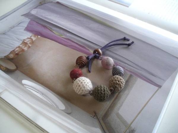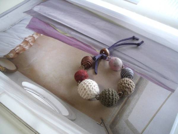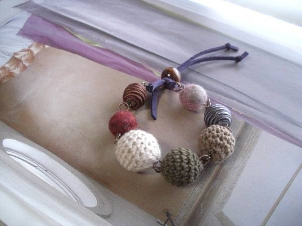 色で遊んで・・シリーズです♪春色セレクト・・ふんわりやさしい春色の異素材のブレスレットです♪10ミリから18ミリ位までのベージュやモーヴピンク、ブラウン、グレーやダークレッドの編みボールやサテンボールやフェルト玉を集めました♪ダークパープルのスェード紐を合わせて甘すぎない大人のロマンチックしています♪長さは全長28センチ位で調節自由です♪お揃いのネックレスも出品しています♪ハンドメイドをご理解いただいてノークレーム・ノーリターンでお願いします♪