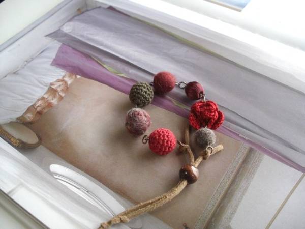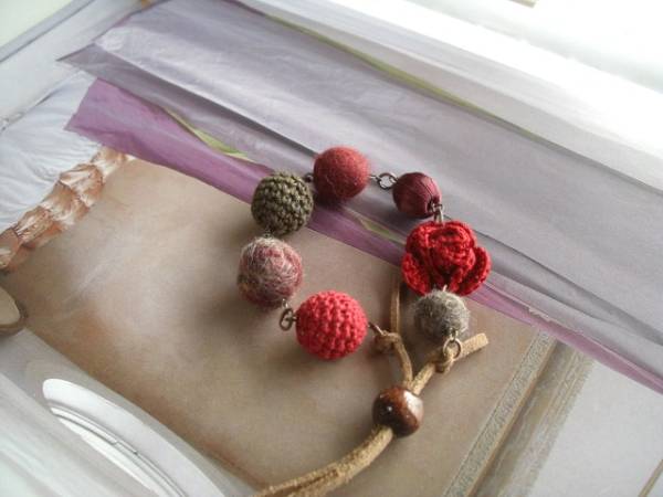 色で遊んで・・シリーズです♪レッド・セレクト・・深い赤のお色でまとめたブレスレットです♪12ミリから23ミリ位までのダークブラウン、モスブラウンやレッドなどの編みボールや編みフラワー、サテンボールを集めました♪コーヒーブラウンのスェード紐を合わせて甘すぎない大人のロマンチックしています♪長さは全長28センチ位で調節自由です♪お揃いのネックレスも出品しています♪ハンドメイドをご理解いただいてノークレーム・ノーリターンでお願いします♪