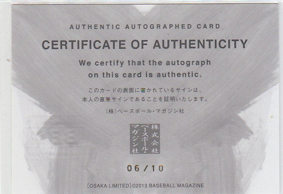 パックから出る直筆サインカードで、10枚のシリアルナンバーが入っています。シリアルナンバーは06/10のジャージーナンバーです。