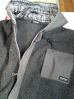 左胸部分にはブランドロゴがあり、フードにはグレーのノバチェック柄があしらわれております。また、左胸部分と左右両肘から下にかけて別布があしらわれており大変オシャレな作りになっております。フロントジッパーもブランド名が入っております。