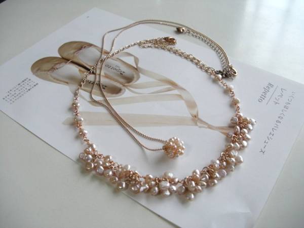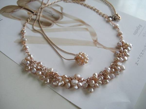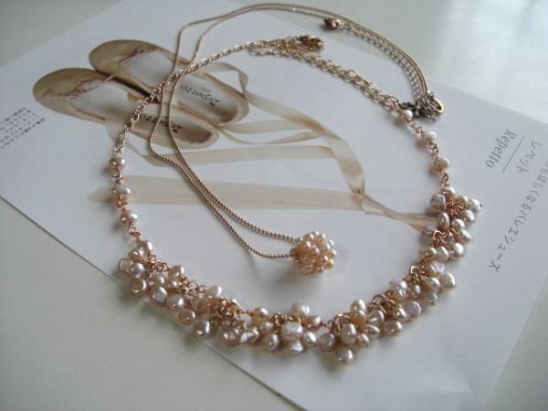 都会のアリス・・シリーズです♪小さなバレリーナ・・可憐な淡いピンクの淡水パールのネックレス2本セットです♪バロックやパール玉の淡水パールにピンクゴールドのチェーンを合わせて大人のロマンチックしています♪5ミリから6ミリ位のバロックの淡水パールは花束のように繋いでロマンチックな表情です♪長さは全長60センチ位で調節自由です♪チョーカー風にされても素敵です♪15ミリ位のパール玉には華奢なボールチェーンを合わせました♪長さは70センチ+アジャスター12センチで最長82センチ位です♪単品やお揃いのブレスレットも出品しています♪シンプルで飽きのこないいつまでも着けられるデザインを考えて作りました!ハンドメイドをご理解頂いてノークレーム、ノーリターンでお願いします