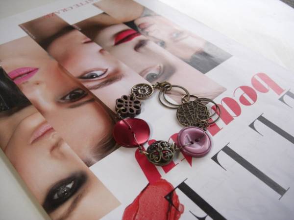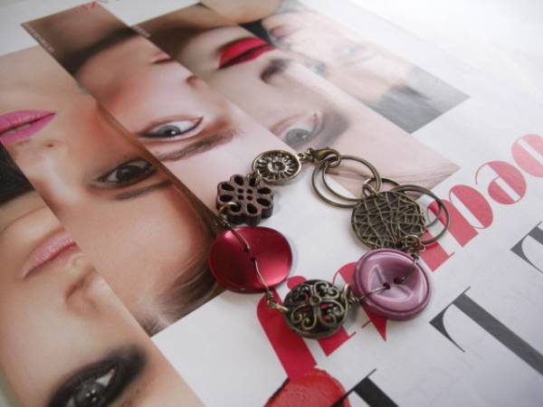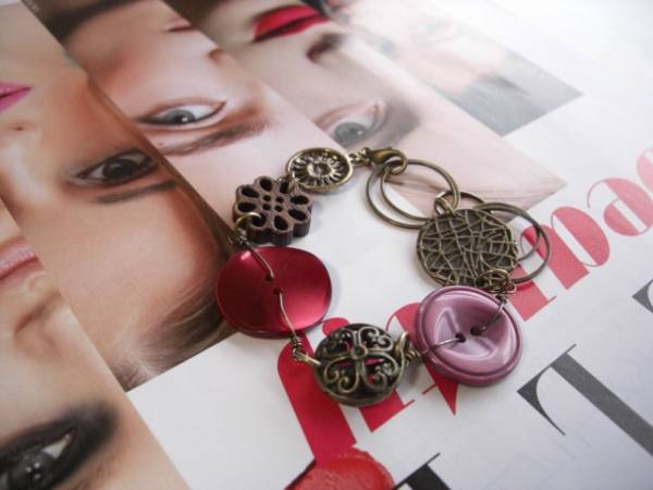 モード革命・・シリーズです♪童話の中から・・深い赤やブラウン、ワインなどシックな秋色の異素材を集めたブレスレットです♪15ミリから22ミリ位までのアンティークボタンや透かしのウッドやデザインチャームなど個性的な異素材を集めました♪デザインチェーンを合わせてキュートな表情です♪長さは全長23センチ位で調節自由です♪お揃いのネックレスも出品しています♪シンプルで飽きのこないいつまでも着けられるデザインを考えて作りました!ハンドメイドをご理解頂いてノークレーム、ノーリターンでお願いします