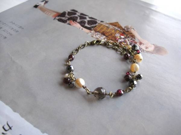 モード革命・・シリーズです♪ガーネットに恋して・・深い赤のガーネットのブレスレットです♪ラウンドのガーネットにスモーキークォーツやヘマタイトやマザーオブパールを合わせてノスタルジックな雰囲気です♪3ミリ、5ミリのガーネットの丸玉に3ミリから8ミリまでのスモーキークォーツやマザーオブパールやヘマタイトを合わせて可憐な表情です♪長さは全長23センチ位で調節自由です♪お揃いのネックレスも出品しています♪シンプルで飽きのこないいつまでも着けられるデザインを考えて作りました!ハンドメイドをご理解頂いてノークレーム、ノーリターンでお願いします