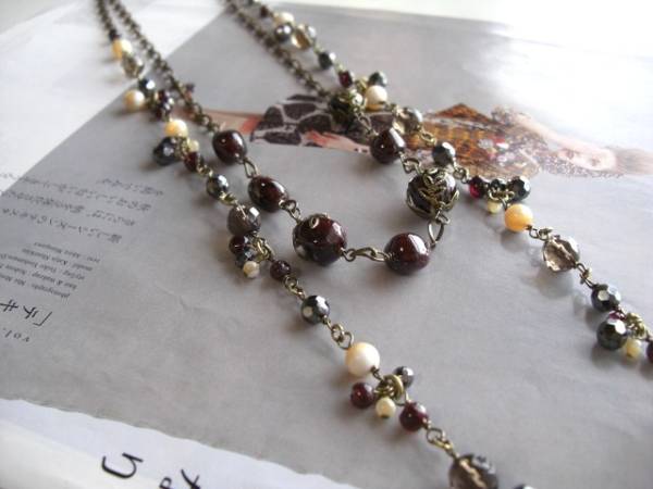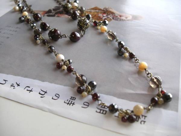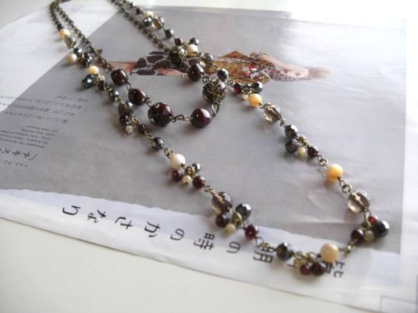 モード革命・・シリーズです♪ガーネットに恋して・・深い赤のガーネットのネックレス2点セットです♪ラウンドやラフタンブルのガーネットにスモーキークォーツやヘマタイトやマザーオブパールを合わせてノスタルジックな雰囲気です♪重ねても単品でも楽しんでいただけます♪9ミリから12ミリ位のラフタンブルのガーネットはシックな座金を合わせました♪長さは全長63センチ位で調節自由です♪チョーカー風にされても素敵です♪長い方のネックレスは3ミリ、5ミリのガーネットの丸玉に3ミリから8ミリまでのスモーキークォーツやマザーオブパールやヘマタイトを合わせて可憐な表情です♪長さは全長87センチ位で調節自由です♪2連にされても可愛いです♪それぞれ単品やブレスレットも出品しています♪シンプルで飽きのこないいつまでも着けられるデザインを考えて作りました!ハンドメイドをご理解頂いてノークレーム、ノーリターンでお願いします