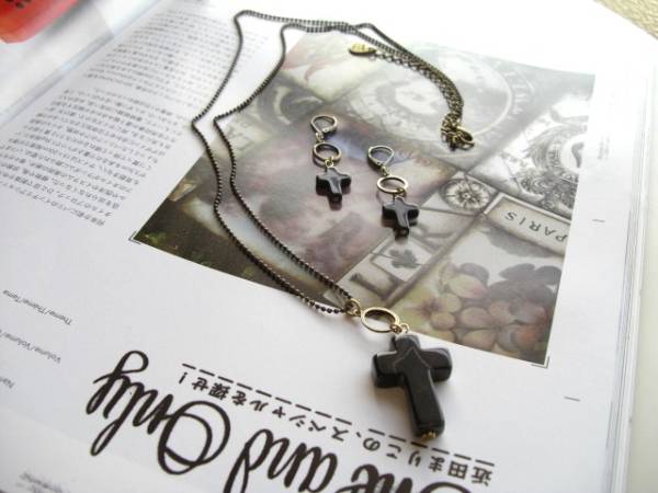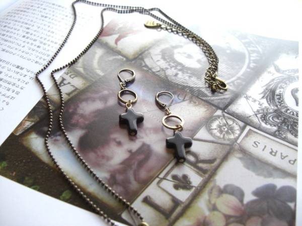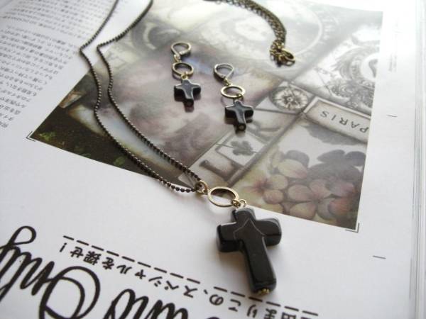 モダン・ガール・・シリーズです♪定番のオニキス・・シックなオニキスのクロスのネックレスとピアスの2点セットです♪繊細なボーンチェーンに30×20ミリのオニキスクロスを合わせてさりげなくパンクしています♪長さは65センチ+アジャスター10センチで最長75センチ位です♪トップは5センチ位です♪ピアスのクロスは16ミリ×12ミリ位です♪長さは全長5センチ位です♪イヤリングにも変更出来ます♪シンプルで長く着けていただけるデザインを考えて作りました♪ハンドメイドをご理解頂いてノークレーム、ノーリターンでお願いします