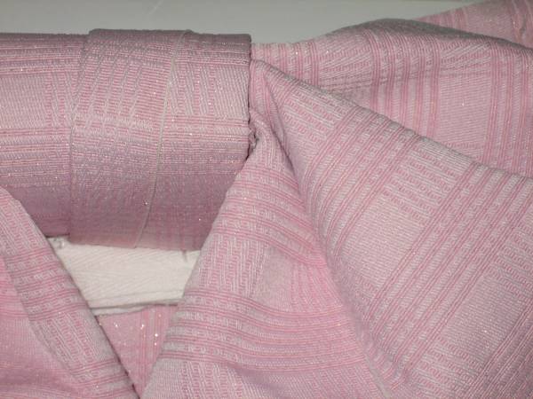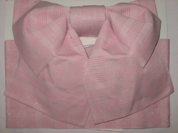女性yukata用、地紋柄結び帯  ポリエステル 薄ピンク(ラメあり)  新品(織り地紋柄ありです。波状の写りはレンズの光学的ないたずらで現品にはありません、また薄く濃く写っている場合もあります)、胴部--帯巾約17,0cmx長さ約130cm、リボン部は横に約30cm。見た範囲で汚れないと思いますが、着用に差し支えない薄汚れ(多分ない?)はあってものお値段で出品です。