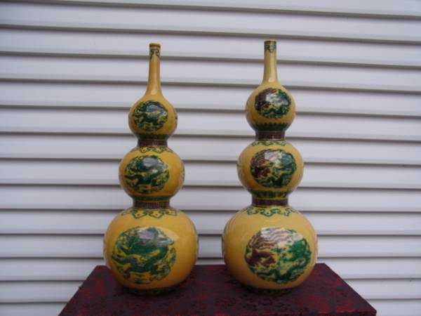 ■□■黄釉粉彩三段瓢箪瓶一対■□■