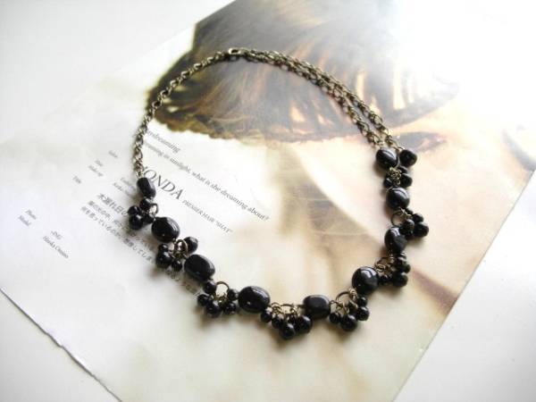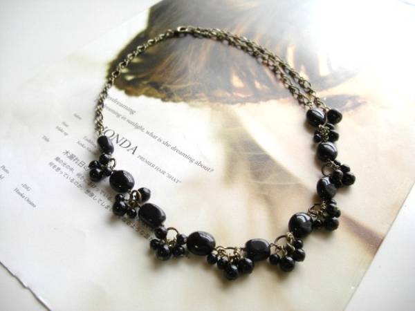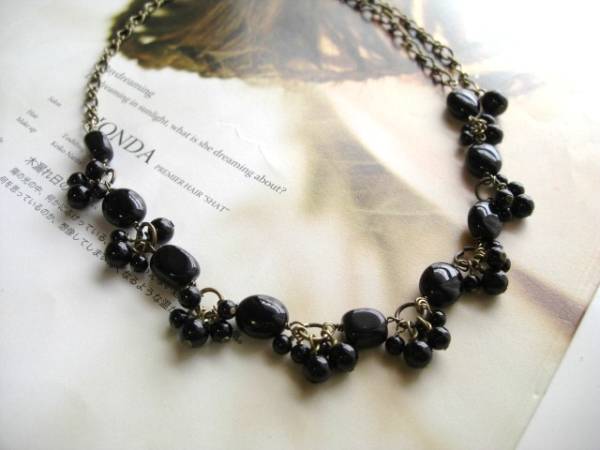 パンク・ガール・・シリーズです♪夜会への招待・・シックなオニキスのネックレスです♪漆黒の丸玉やオーバルのオニキスを合 わせてアンティークな表情です♪4ミリ、6ミリの丸玉、8×10ミリのオーバルのオニキスはアンティークチェーンでレースのように繋いで重厚な雰囲気です ♪長さは全長55センチ位で調節自由です♪チョーカー風にされても素敵です♪お揃いのネックレスやブレスレットやイヤリングも出品しています♪シンプルで飽きの こないいつまでも着けられるデザインを考えて作りま した♪ハンドメイドをご理解頂いてノーク レーム、ノーリターンでお願いします