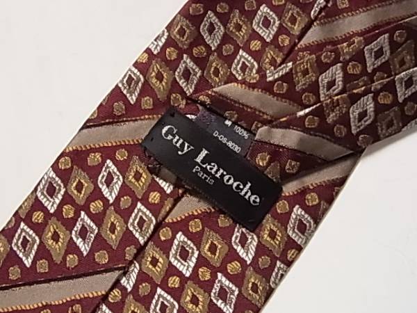新品同様美ユーズド品。ギラロッシュ(Guy Laroche)ネクタイ。素材はシルク(絹)100%。大剣最大幅約9.5センチ。幾何学柄とストライプ柄。ベース色は小豆色レッド系。