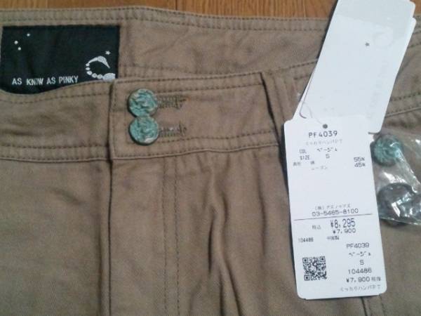 袋・タグ付き新品が半額以下!くったりハンパPT 定価税込8295円。予備ボタン付き。Sサイズは総丈最長部約60cm・身幅最上部約37cm・片もも幅約25cm・股下約40cm・裾幅約20cm。素人採寸なので誤差はご了承を。