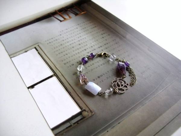 モードな秋色・・シリーズです♪紫の貴婦人・・神秘的なアメジストのブレスレットです♪ランダムカットやコイン、ラフタンブルやツイストナツメなどデザイン違いのアメジストやアメトリンにフローライトやブルーレースや薔薇の透かしチャームを合わせてシックにロマンチックしています♪アメジストは4ミリから17ミリ位までのデザイン違い、ブルーレースはスクエアカット、フローライトは6ミリ位です♪長さは23センチ位で調節自由です♪お揃いのネックレスも出品しています♪シンプルで飽きのこないいつまでも着けられるデザインを考えて作りました!ハンドメイドをご理解頂いてノークレーム、ノーリターンでお願いします
