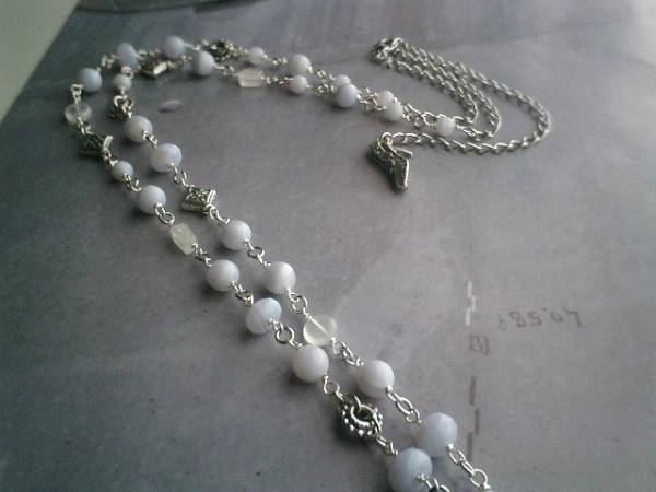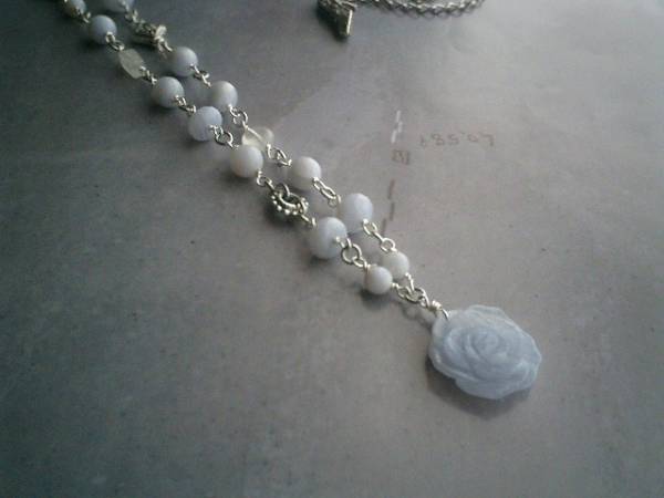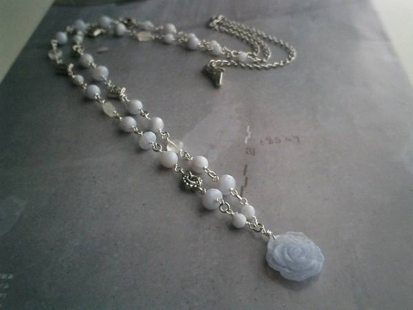 アート・ロマン主義・・シリーズです♪アンジーの夏・・可憐なブルーレースと薔薇のネックレスです♪シックなブルーグレーのブルーレースは6ミリの丸玉、8ミリの丸玉、8×5ミリ位のボタンカットです♪8ミリのコインやチューブのホワイトムーンストーンやデザインメタルを合わせてひそやかにロマンチックしています♪トップのブルーレースの薔薇は19ミリ位です♪長さは85センチ位で調節自由です♪トップは23ミリ位です♪お揃いのネックレスも出品しています♪シンプルで飽きのこないいつまでも着けられるデザインを考えて作りました!ハンドメイドをご理解頂いてノークレーム、ノーリターンでお願いします