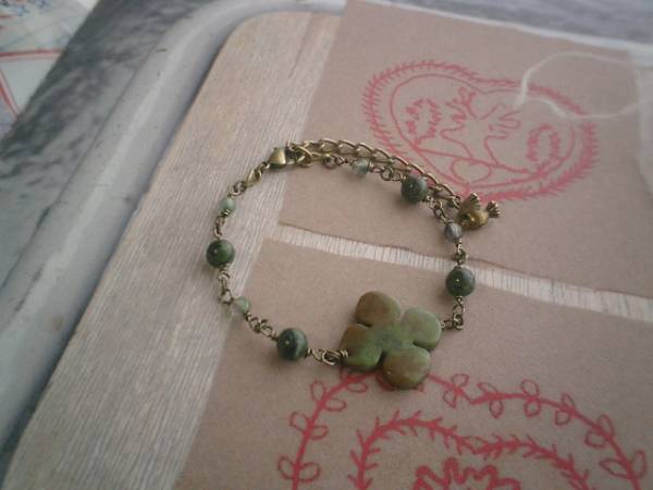 イノセント・ガール・・シリーズです♪幸せ気分で・・シックな秋色のグリーンオパールのブレスレットです♪グリーンオパールは6ミリの丸玉とトップは20ミリのフラワー型です♪フローライトの4ミリのカットラウンドを合わせて繊細でロマンチックな表情です♪長さは全長23センチ位で調節自由です♪お揃いのネックレスも出品しています♪♪お揃いのシリーズも出品しています♪シンプルで長く着けていただけるデザインを考えて作りました♪ハンドメイドをご理解頂いてノークレーム、ノーリターンでお願いします