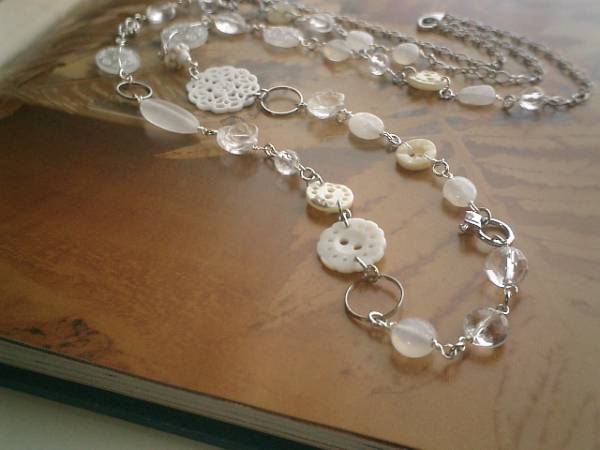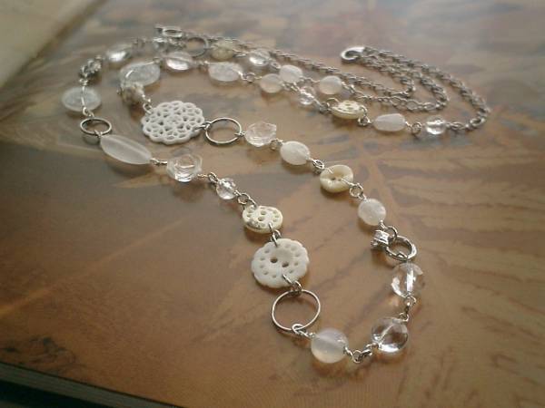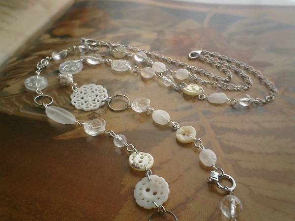 個人的創作ノート・・シリーズです♪ロマンチックが好きですか?可憐な素材を集めたネックレスです♪8ミリのコイン、10ミリのオーバルのムーンストーン、6ミリ、8ミリのランダムカット、8ミリのコインカット、8×10ミリのオーバルカット、11ミリ位の薔薇の水晶、20×10ミリ位のマーキスのフロスト水晶、アンティークのシェルボタンやお花模様の13ミリ、15ミリのボタン、12ミリから20ミリ位までの大きさ違いのレース模様のシェルボタンやジルコニアリングなどを集めて可憐な表情のネックレスです♪長さは全長93センチ位で調節自由です♪2連にされても素敵です♪同じデザインの長さ違いのネックレスやお揃いのブレスレットやピアスも出品予定です♪シンプルで飽きのこないいつまでも着けられるデザインを考えて作りました!ハンドメイドをご理解頂いてノークレーム、ノーリターンでお願いします