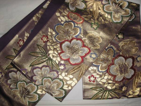 京都西陣 じゅらく の 若向きよう(振袖、訪問着、付け下げ、無地、小紋、など向き)のTOPブランド品『花かるた(花かおり)いろあそび』ブランドです。6通柄袋帯 新品未仕立て品、絹100%金属糸等使用 (西陣証紙) さび紫に金色のきんの生地に はな笹、、 (裏地さび紫)