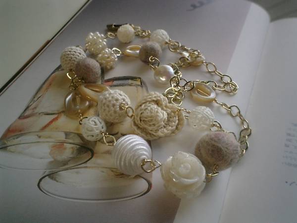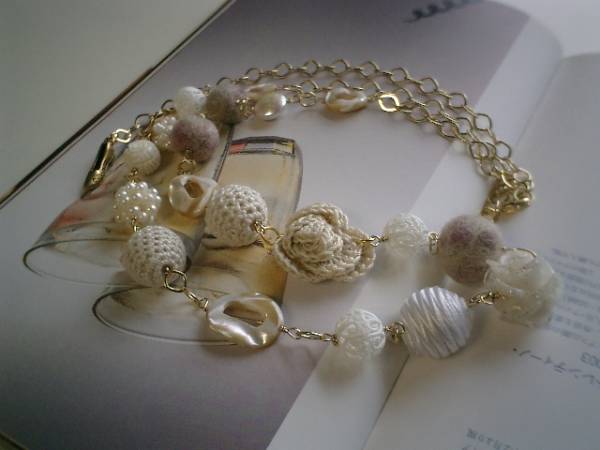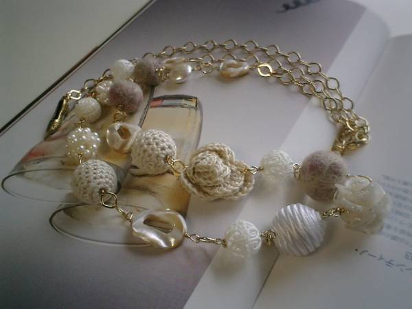 秋のクローゼットシリーズです♪キュートな異素材を集めてベージュピンクのイメージでまとめたネックレスです♪ベージュピンクやオフホワイトなど様々なお色が混ざったフェルト玉は12ミリから18ミリ位までの大きさ違いです♪12ミリの彫りボーンや淡水パールボールや10ミリの淡水パールのコインやベージュのシェルのオーバルリングや18ミリの樹脂薔薇やサテンボールや編み薔薇などロマンチックな素材を集めてやさしい表情です♪ベージュトーンでまとめているので色々なシーンで楽しんでいただけます♪長さは全長95センチ位で調節自由です♪2連にされてチョーカー風に着けても素敵です♪お揃いのブレスレットやピアスや同じシリーズも出品しています♪シンプルで飽きのこないいつまでも着けられるデザインを考えて作りました!ハンドメイドをご理解頂いてノークレーム、ノーリターンでお願いします