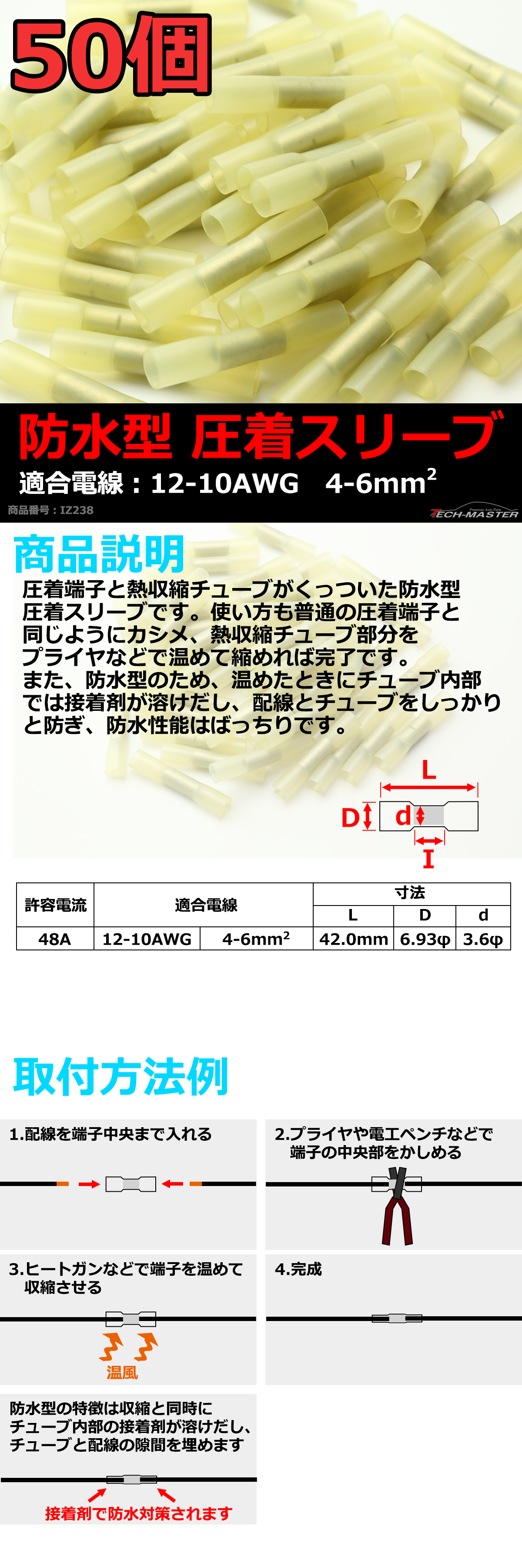 | 防水型 圧着スリーブ 数量:1セット 50個 ・適合配線4-6平方ミリメートル 12-10AWG |