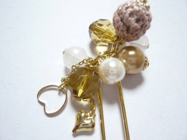 | 2個のハートのチャームと手編みのモチーフが可愛いです。 | ||