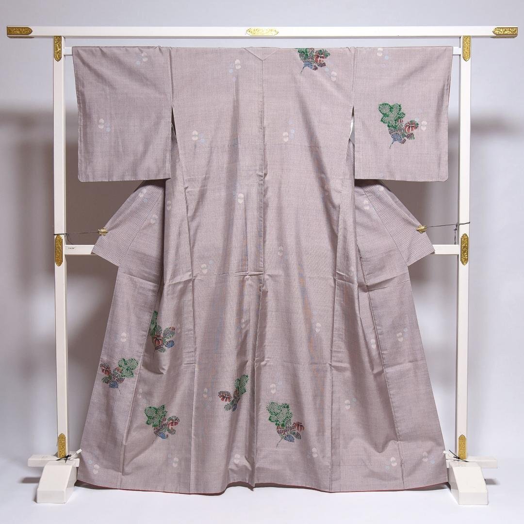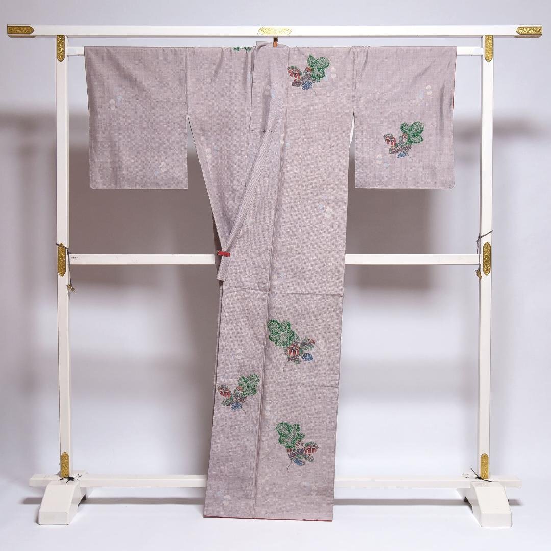 【ほりだし堂】 お仕立て済み 大島紬 一元式 七マルキ 着物 絞り入り植物 灰色 美品