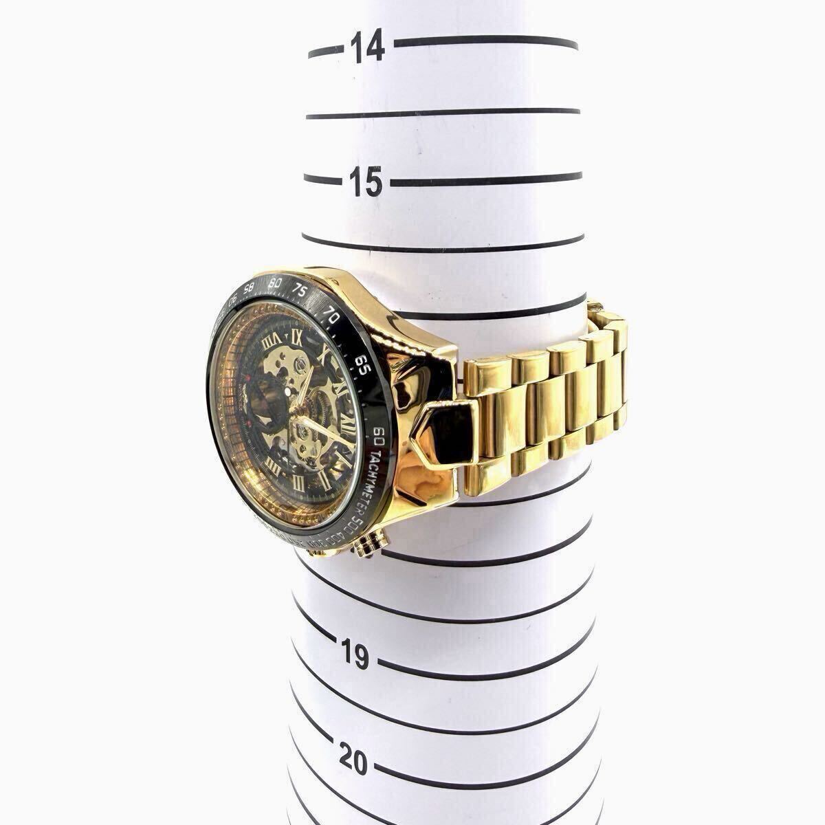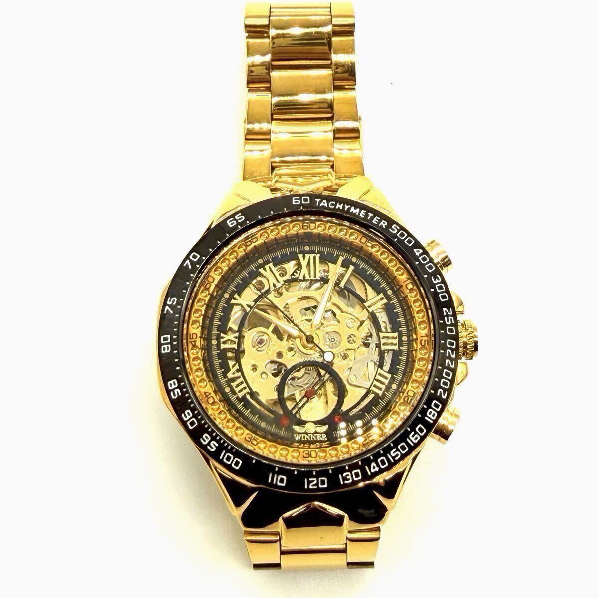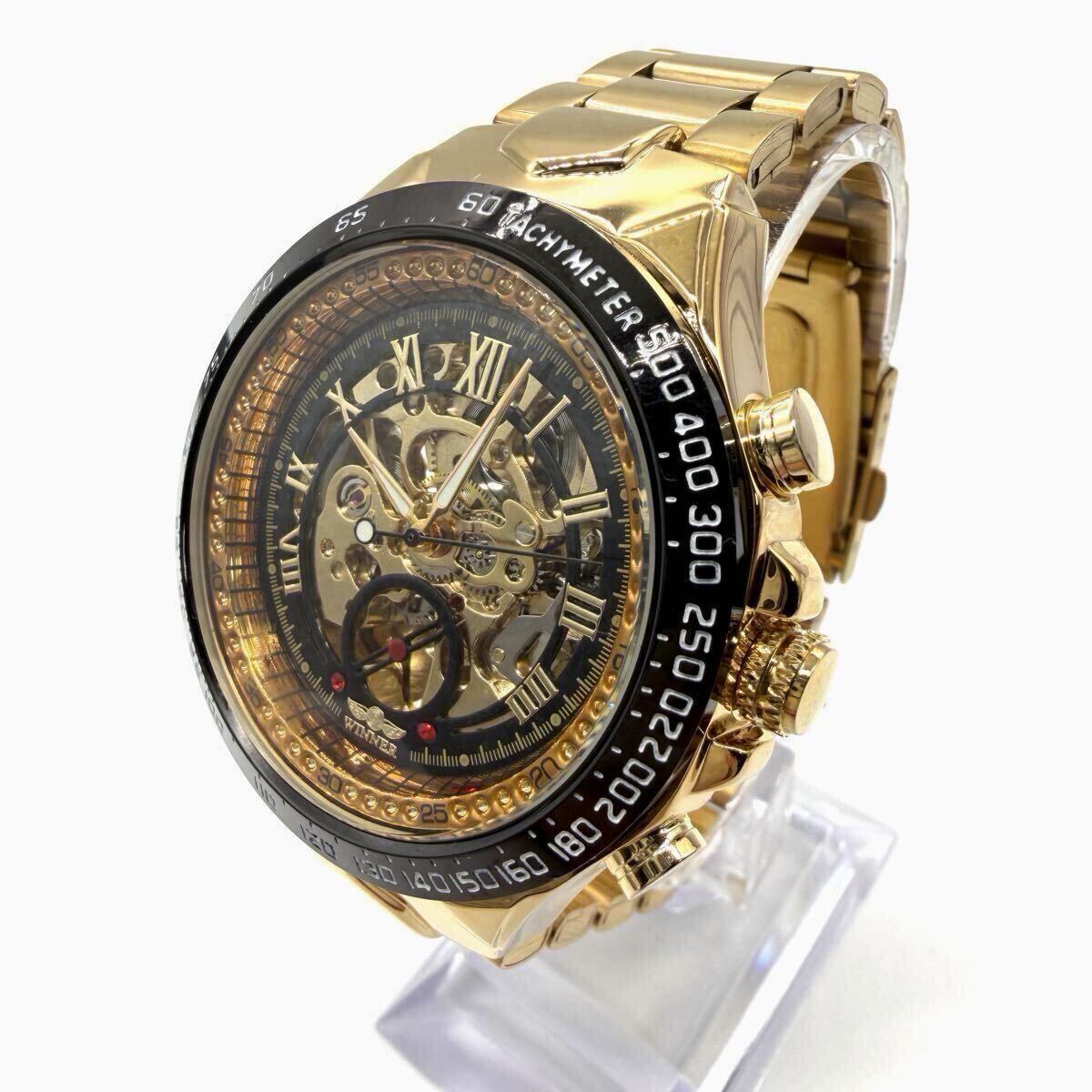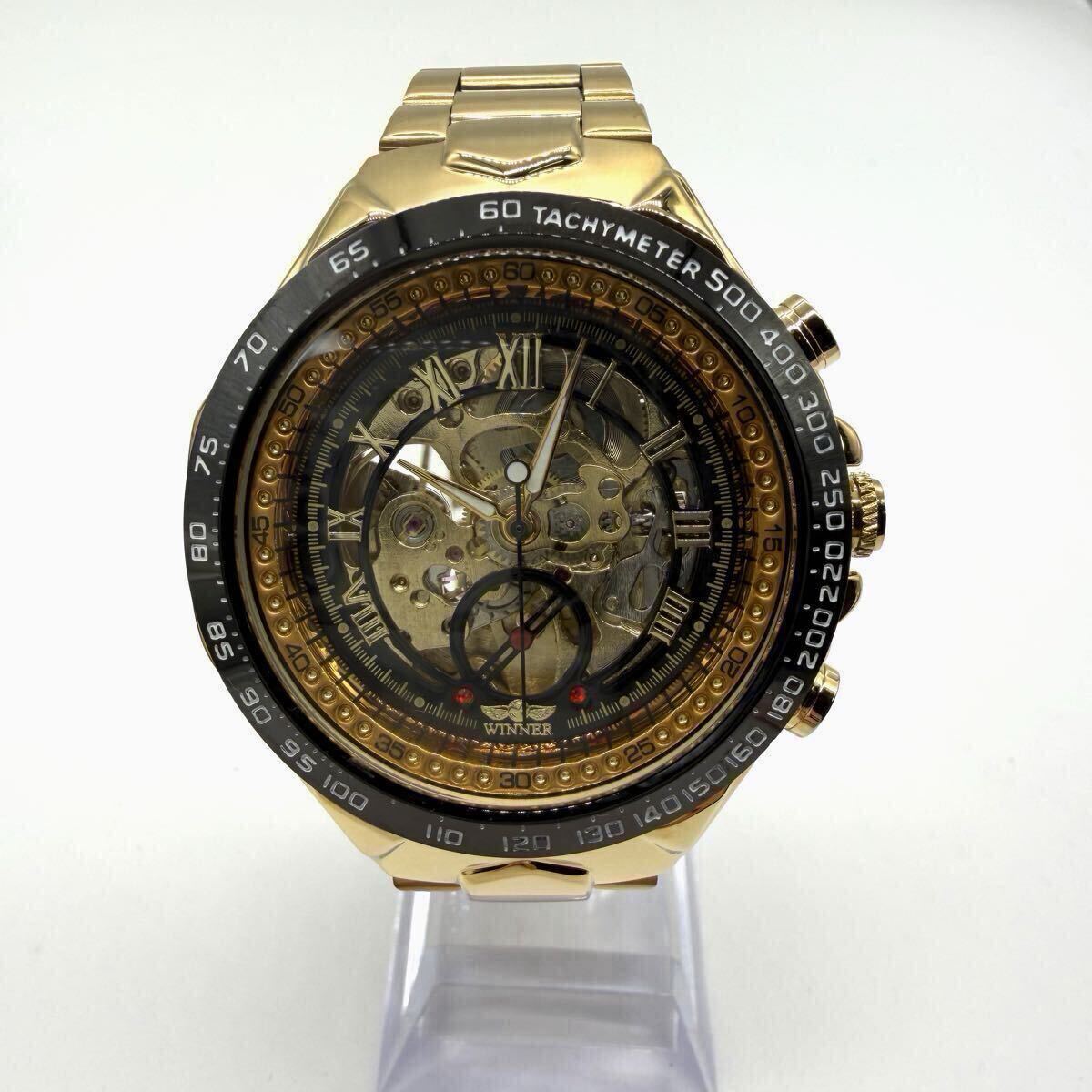 ◆稼働品◆WINNER メンズ腕時計 スケルトンウォッチ 自動巻き クロノグラフ ゴールドx黒 時計 コンビ