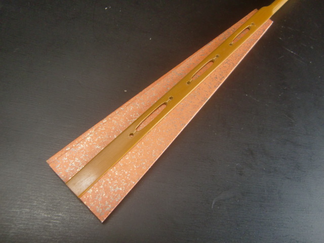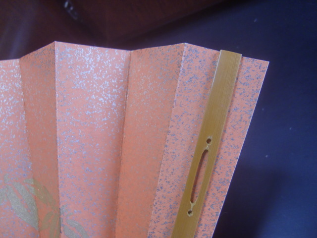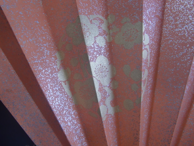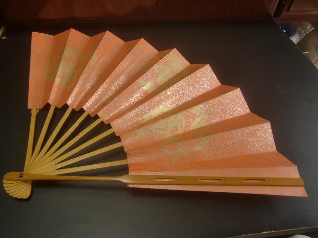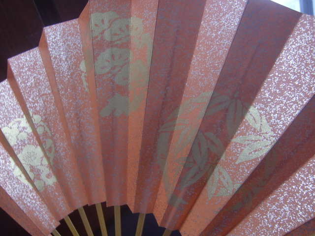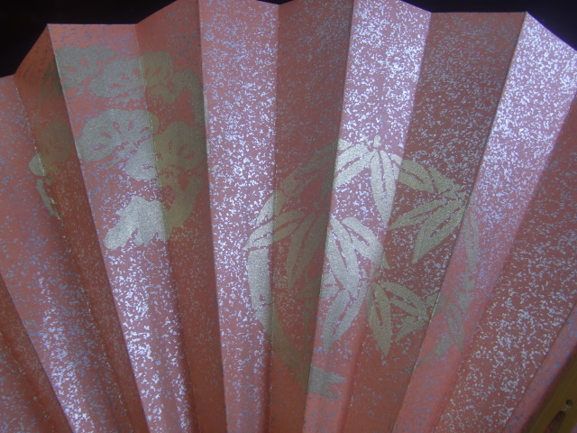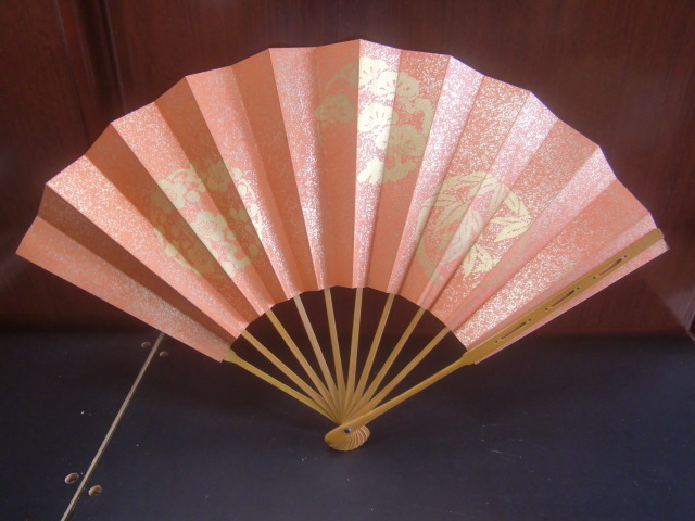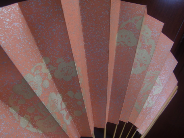 扇 十松屋福井扇舗 鉛丹色地に金砂子と金松竹梅 美品 サイズ 33,5cm ゆうパック発送でのお取引とさせていただきます。