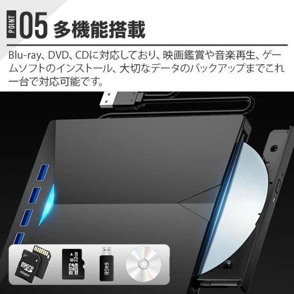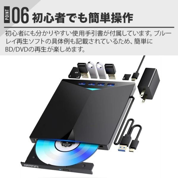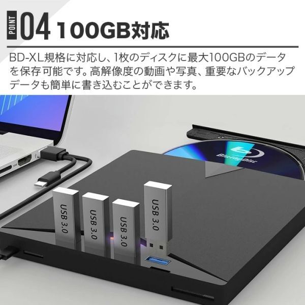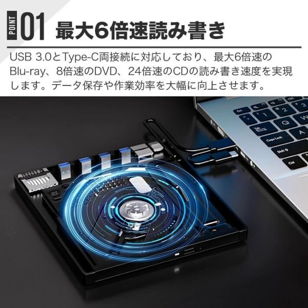 ブルーレイドライブ 外付け DVDドライブ 6X USB3.0/Type-Cポート 軽量 薄型 CD/DVD読取・書き込み ポータブルBlu-rayプレーヤー