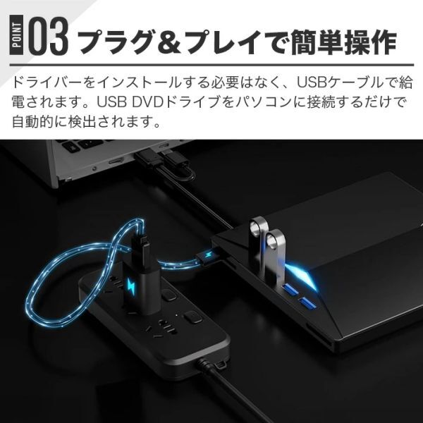 ドライバーをインストールする必要はなく、USBケーブルで給電されます。USB DVDドライブをパソコンに接続するだけで、自動的に検出されます。収納に便利な内蔵ケーブルなので、ケーブルを紛失する心配もありません。