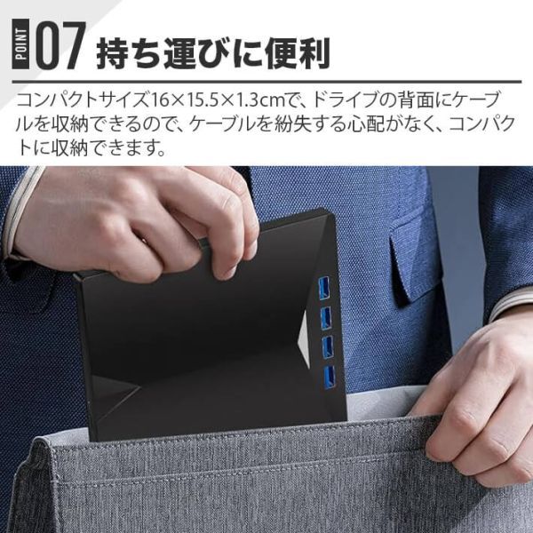 コンパクトサイズ16×15.5×1.3cmで、ドライブの背面にケーブルを収納できるので、ケーブルを紛失する心配がなく、コンパクトに収納できます。表面には4本の滑り止めゴムがついており、安定感も抜群です。