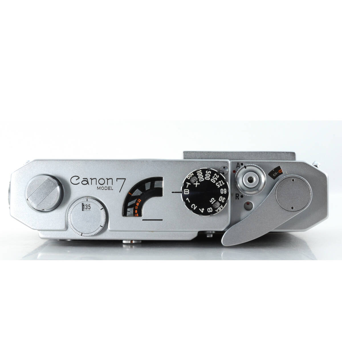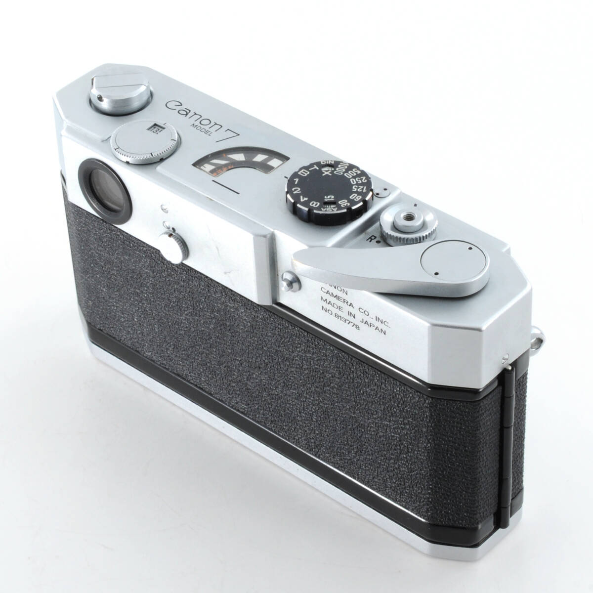 Canon7は1950年代に発売された高級レンジファインダーカメラで、TTL露出計を搭載しプロから趣味まで幅広く愛されたモデルです。完動品で光学系も良好ですが、二重像の微調整状態にご注意のうえご検討ください。