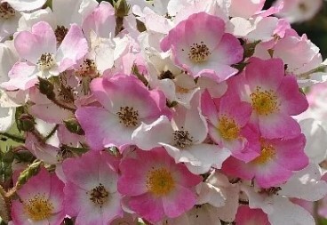 秋にも少し返り咲き、フェンスやトレリスに好適です。花がらを切らない場合は秋に実も付けます。