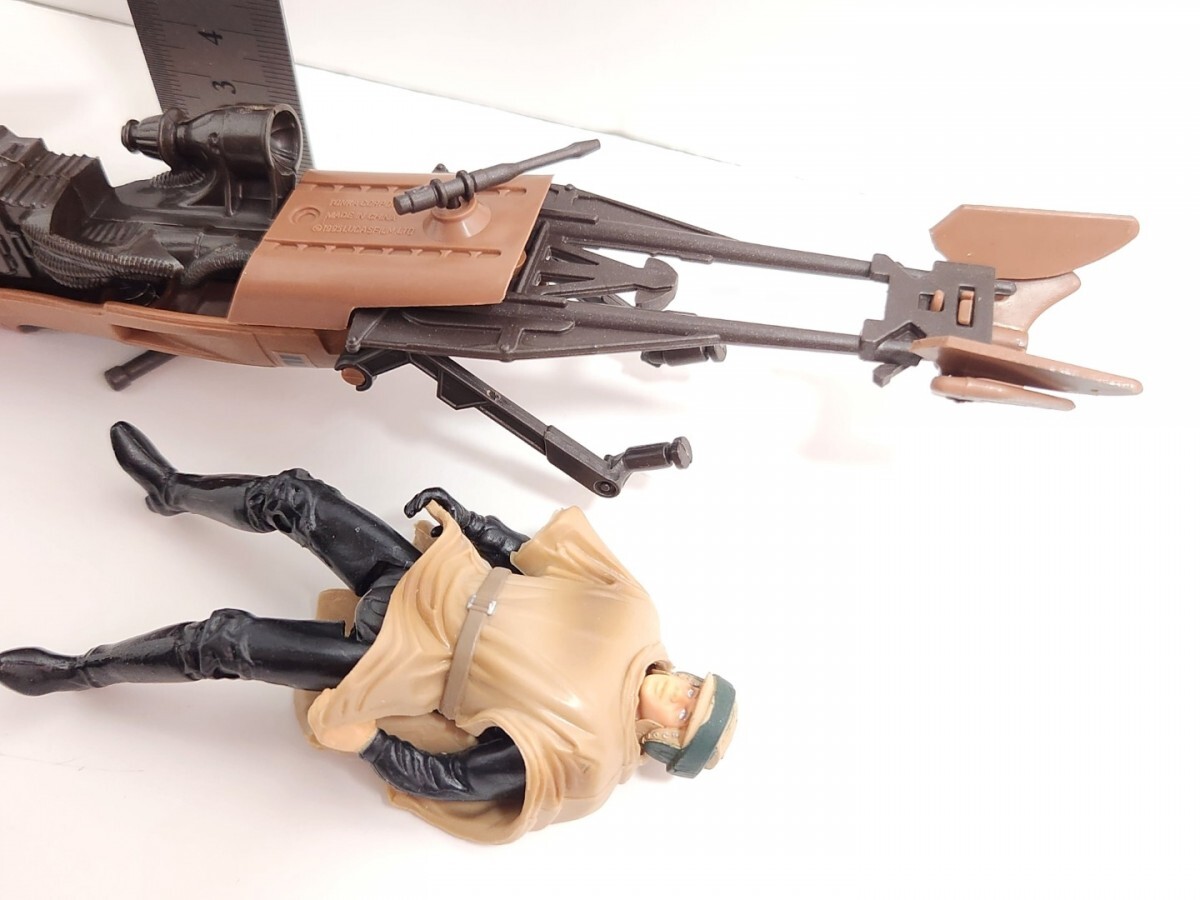 ややコスレ感。おおむね良好の商品です。スピーダーバイクの長さが約20〜21cm。バイクの足のバネが緩くなっています。銃とライトセーバー付きます。