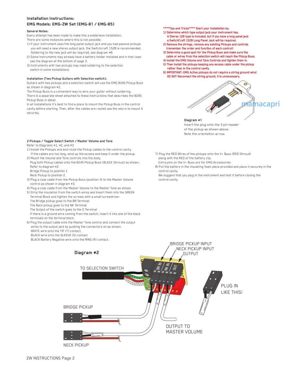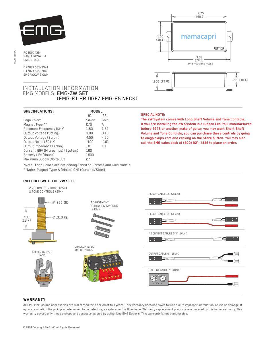 米国 アメリカ製 Made In U.S.A. ZW Set Known the world over as one of the greatest guitar players ever, Zakk Wylde relies on his EMG 81/85 signature humbucker set for his aggressive tone and sustain. *This classic setup comes complete with long shaft volume and tone controls for installation*. Short Shaft versions are also available, please check your instrument before making your wiring kit selection. Make sure to check the instructions for pickup measurements before purchasing to compare your existing pickups with EMG models. In The Box Package Includes EMG's exclusive Solderless Install System: 2 25k long shaft volume pots 2 25k long shaft tone pots 1 battery bus 1 stereo output jack 1 two pickup in/out bus 2 pair mounting screws and springs 2 pickup cables 4 connect cables 1 output cable 1 battery cable |