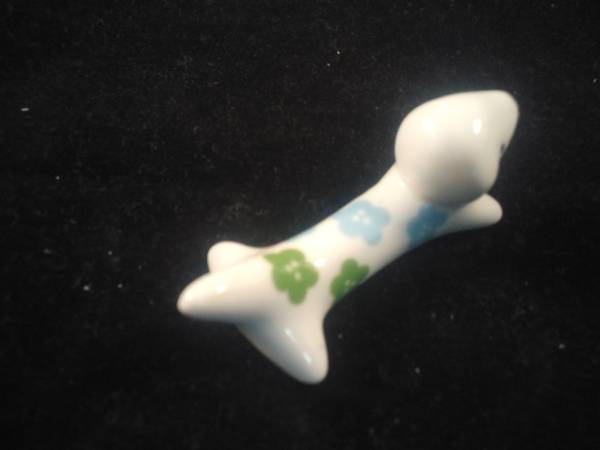 かわいい犬の陶器箸置きです。 ブルーとグリーンの花柄。