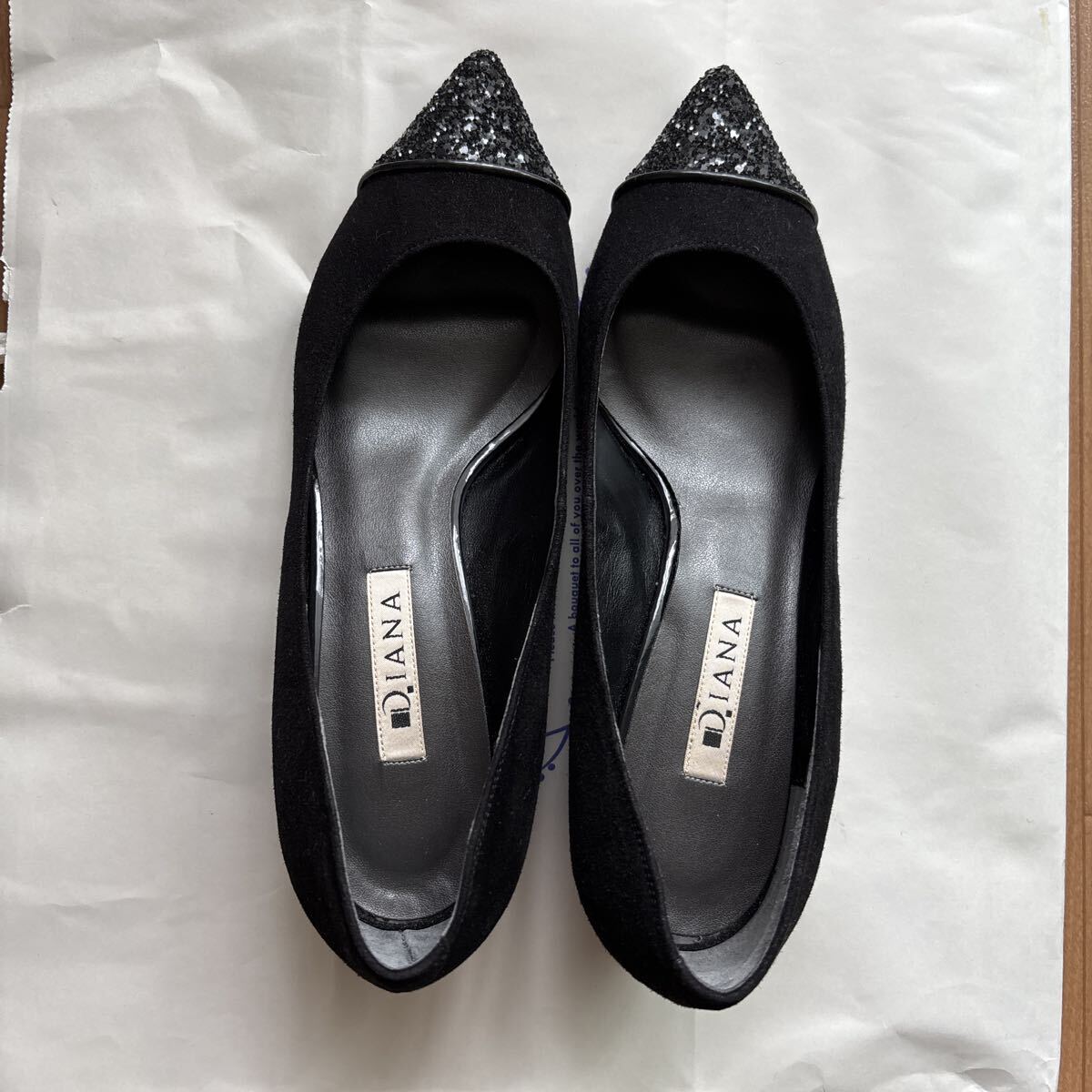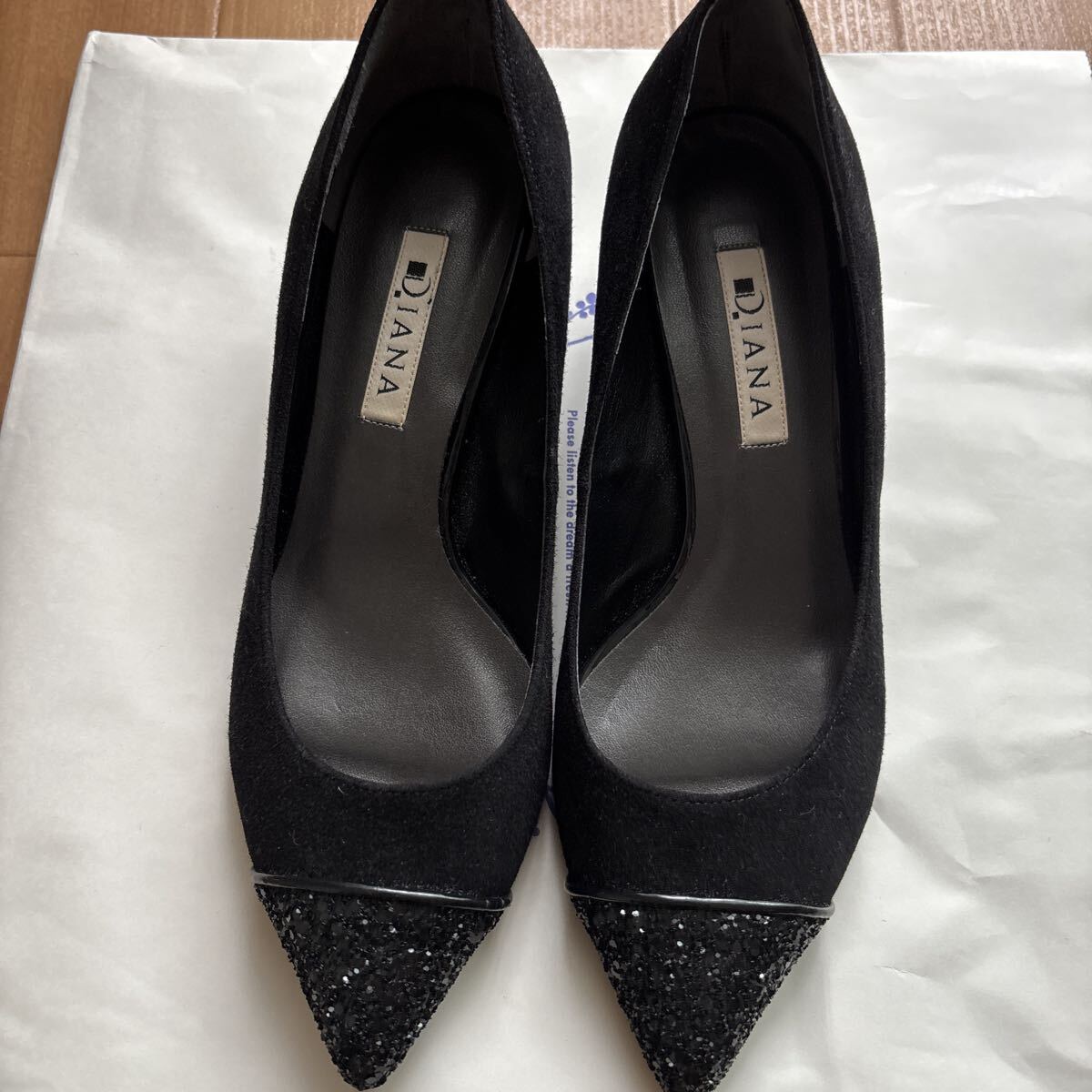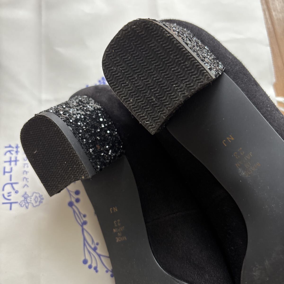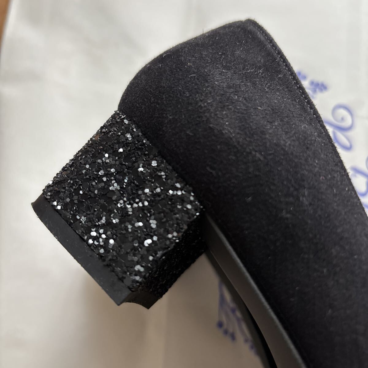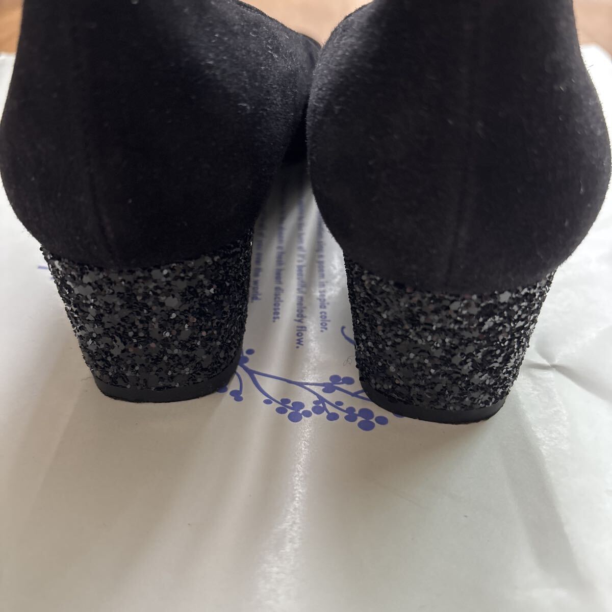 スエード素材でヒールの先とヒールの部分が、ラメでとても綺麗です。ヒールは、およそ4㎝です。
