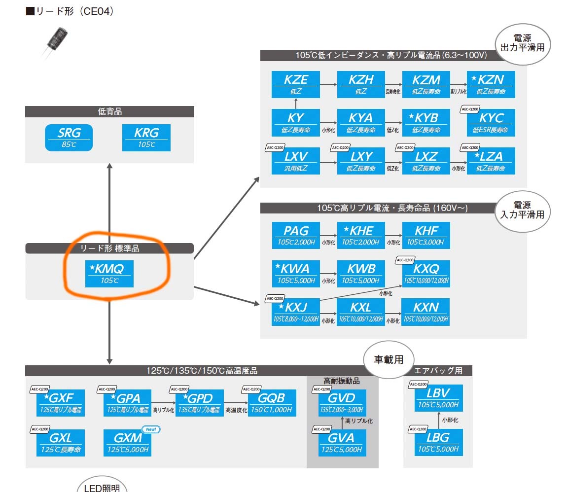 手軽に使える汎用電解コンデンサとして多くの方に愛用されてきた日本ケミコンのSMG/KMGは生産終了して、KMQに一本化されました