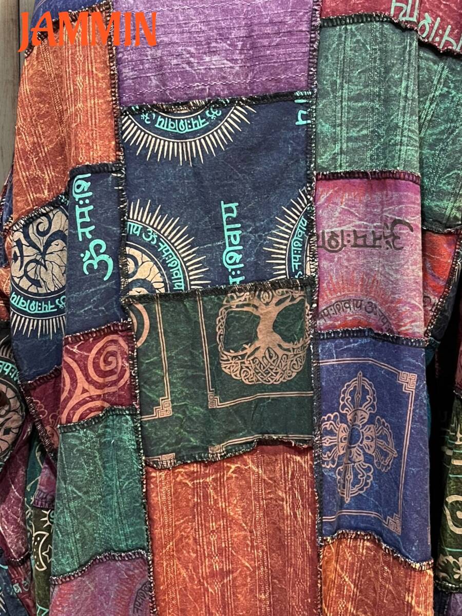 色々なアジアン柄(タイダイ、ストーンウォッシュ、オーム紋様、植物、民族柄、ヒンディ語など)生地が使われていて、全体に味のあるストーンウォッシュ加工入り。