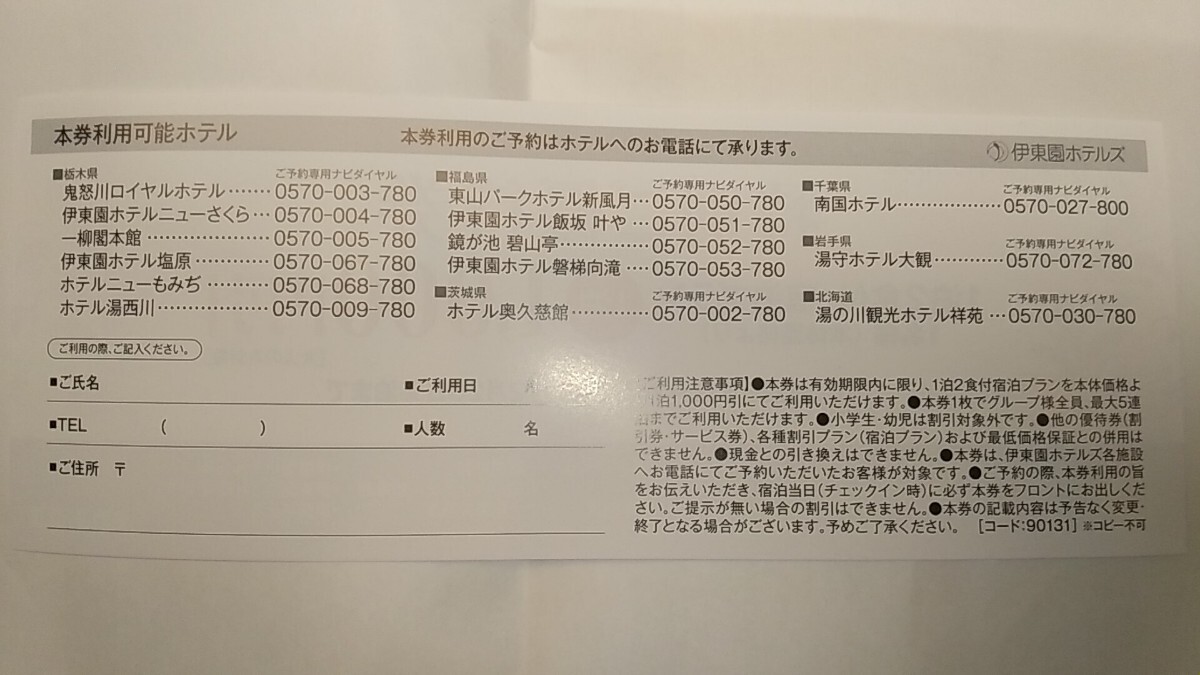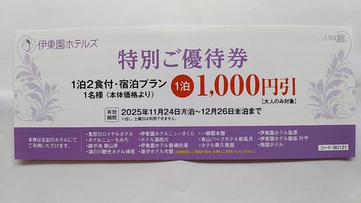 伊東園ホテルズの特別ご優待券です。有効期間は、11月24日~12月26日です。