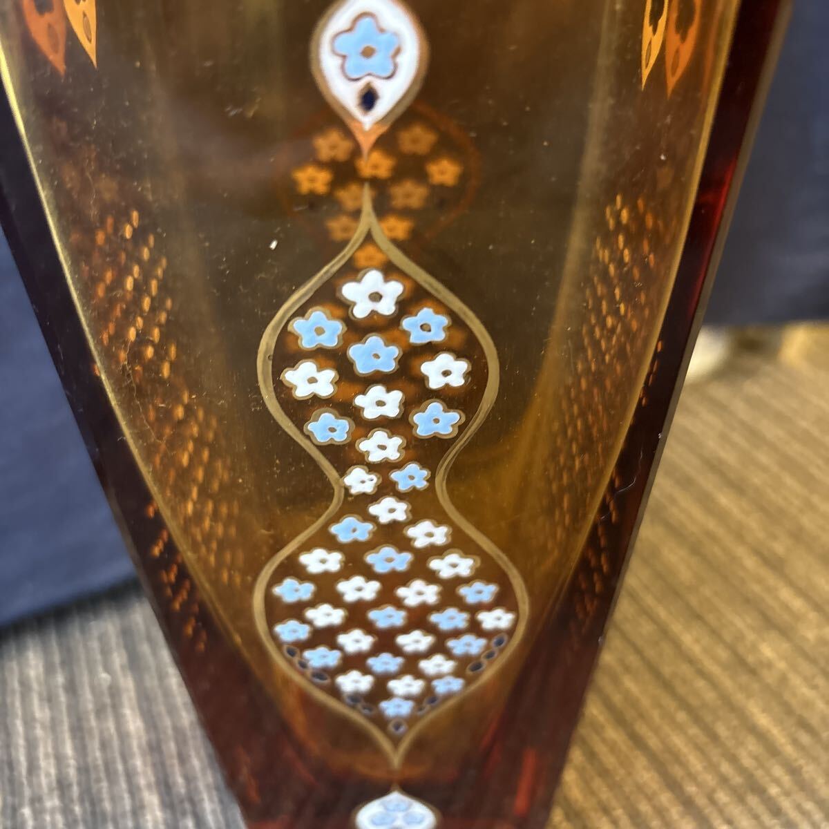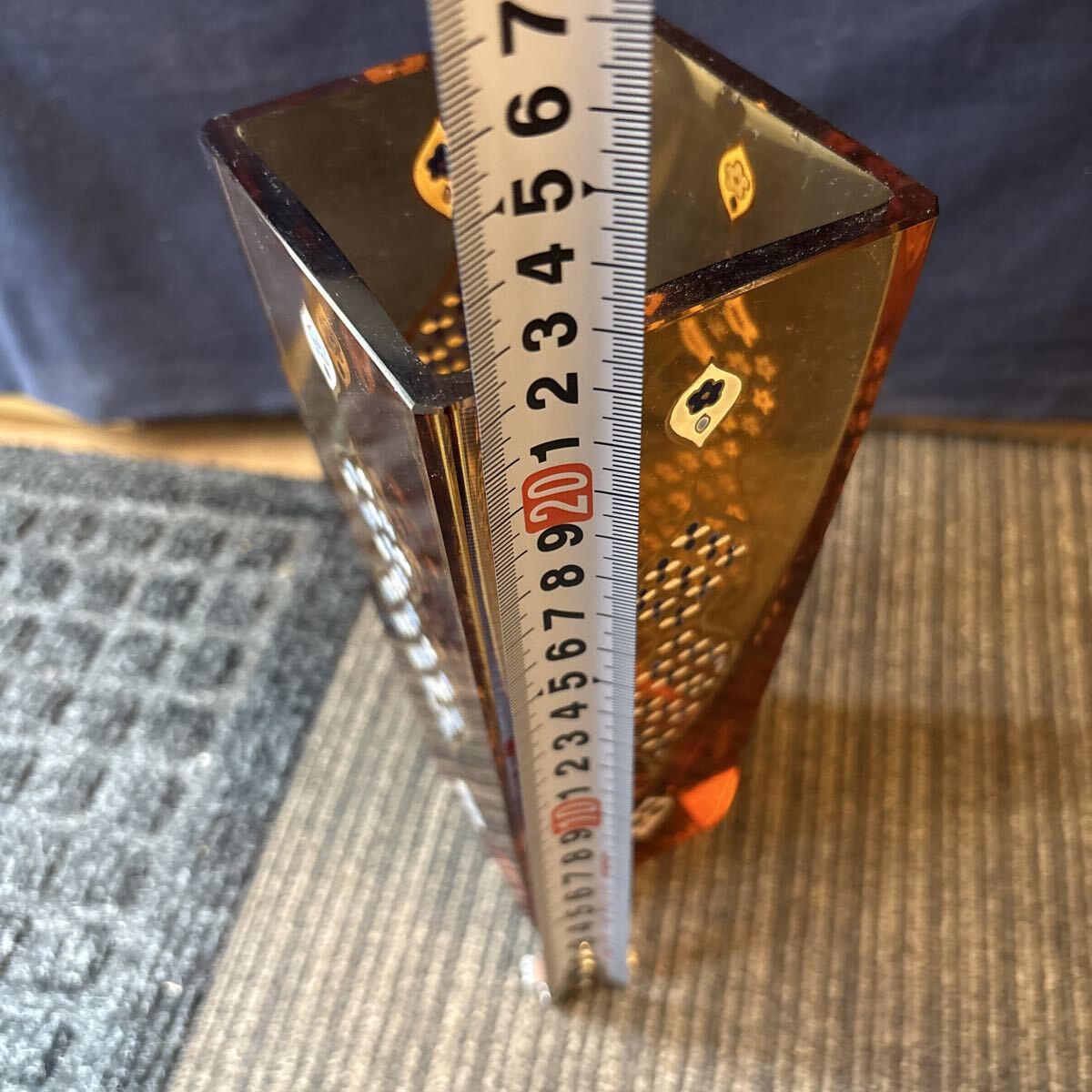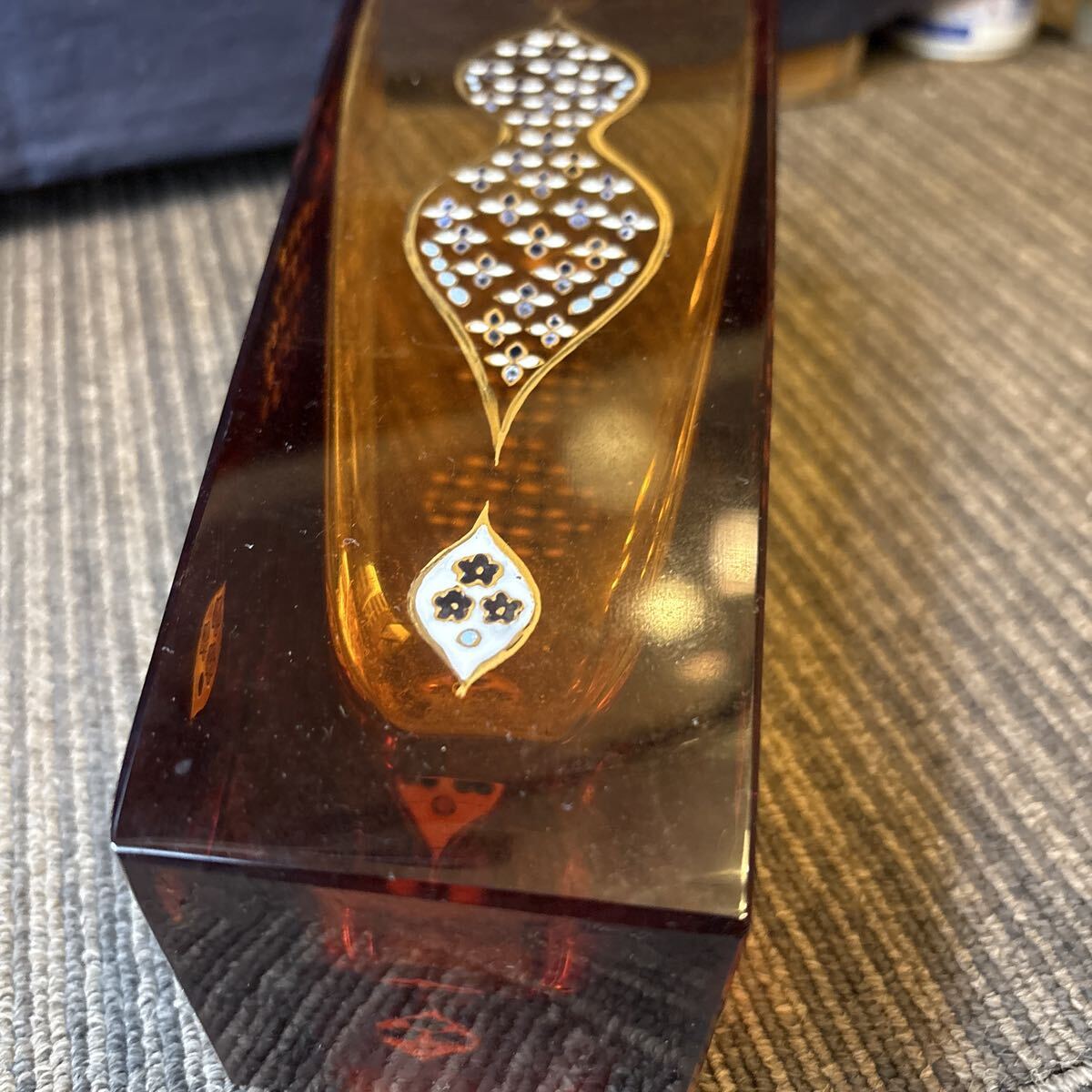 雨宮喜能登 作 窯彩硝子 金彩 エナメル彩 カットガラス 花入 花瓶 アンバー