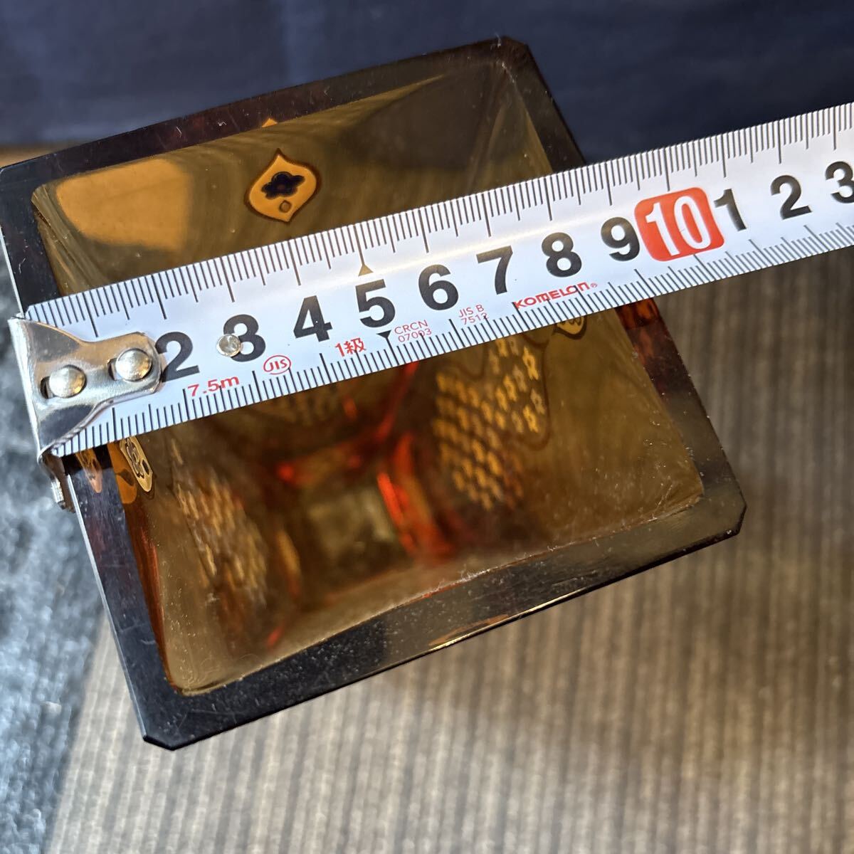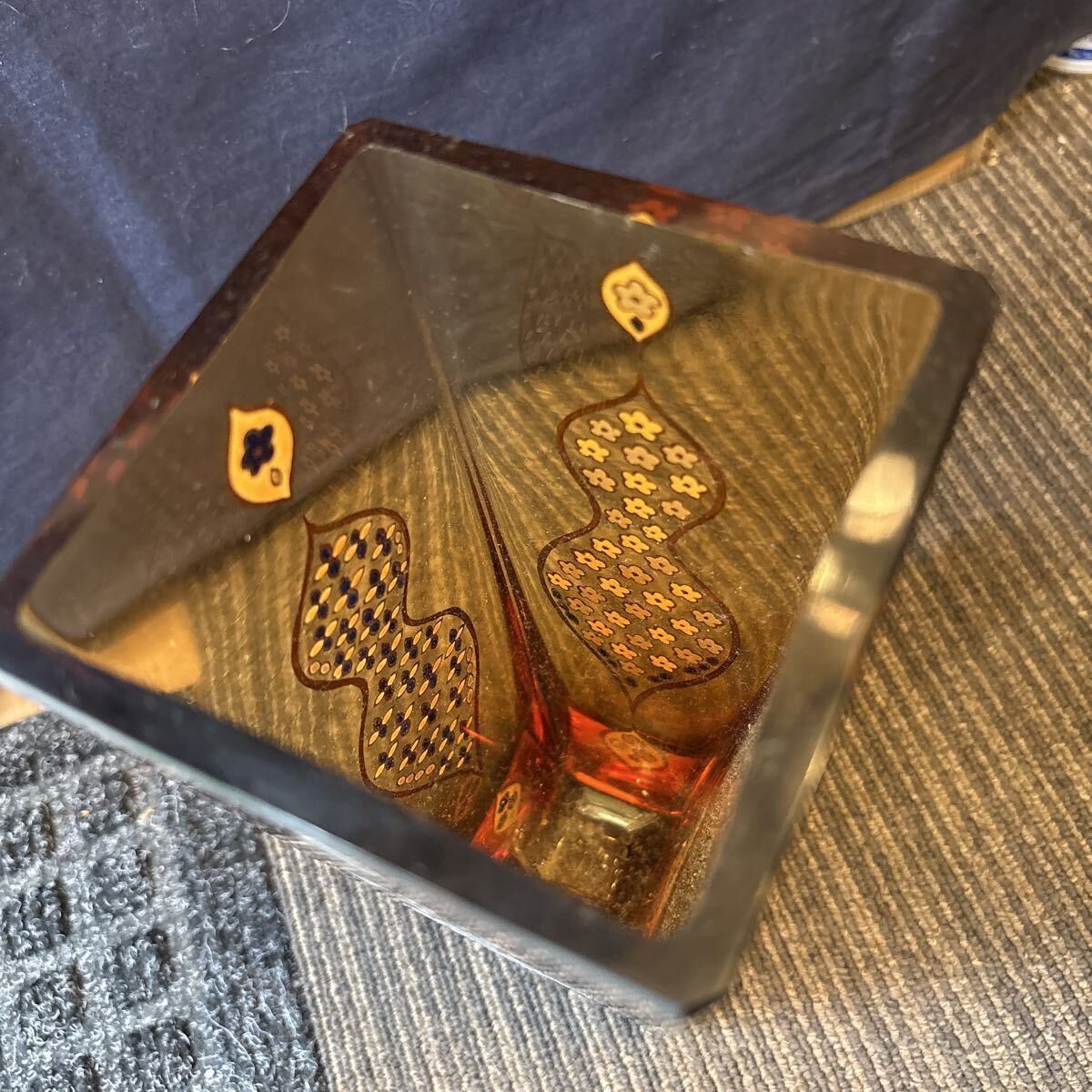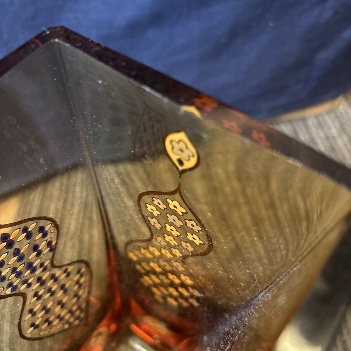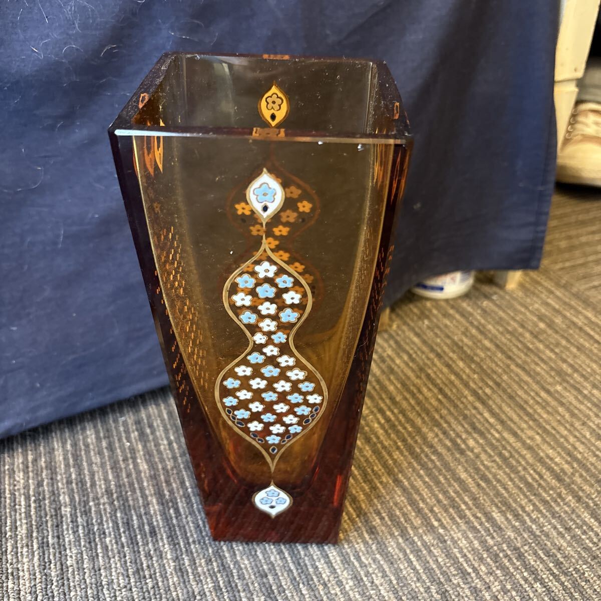 雨宮喜能登 作 窯彩硝子 金彩 エナメル彩 カットガラス 花入 花瓶 アンバー
