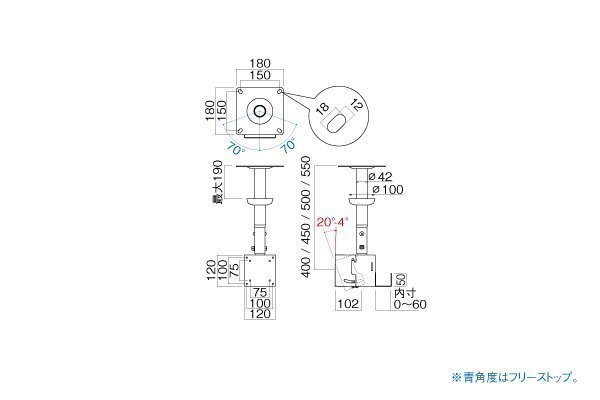 角度調節:前方20度、後方4度、左右各70度(任意調節可能)