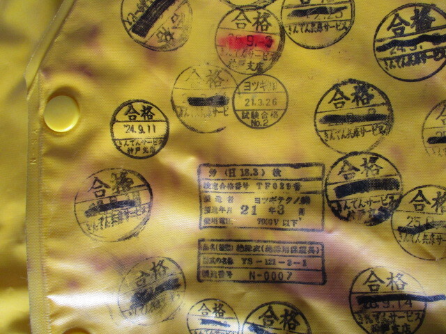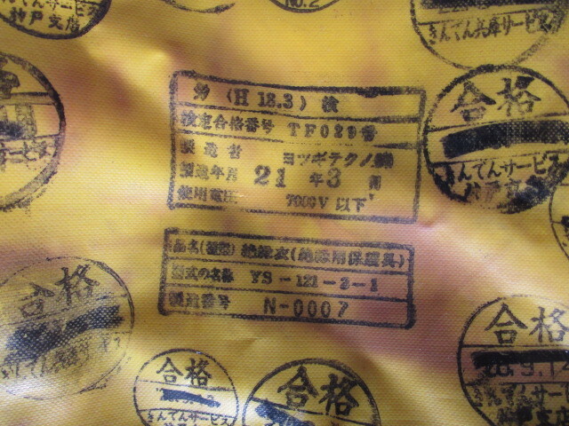 ヨツギテクノ製 絶縁衣(絶縁用保護具) 型式番号 YS-121-2-1 検定合格番号 TF029号 製造年 2021年3月
