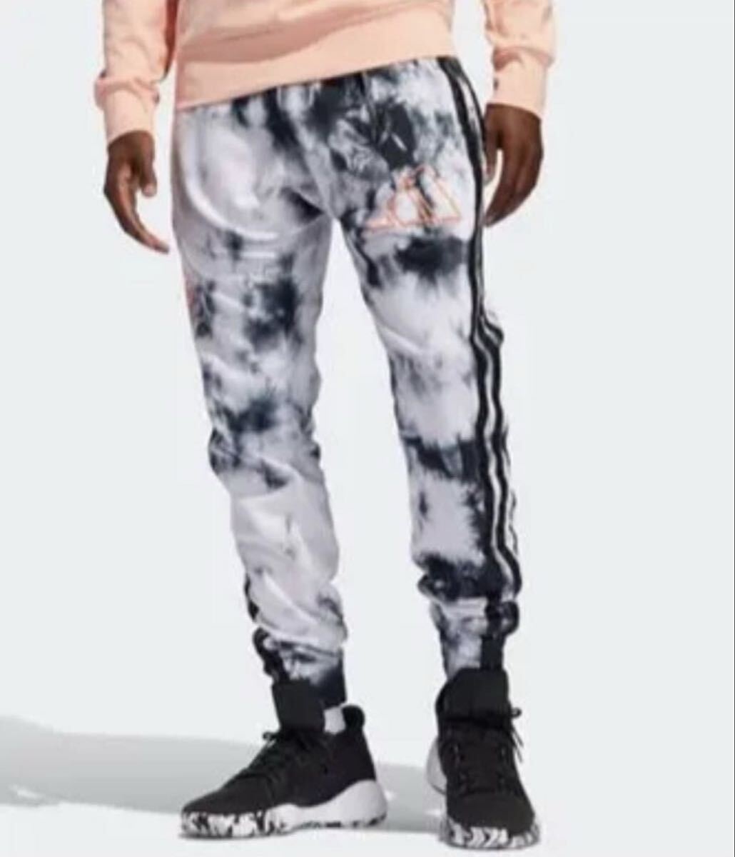 タイダイ柄のadidasジョガーパンツ、サイドストライプ付き。